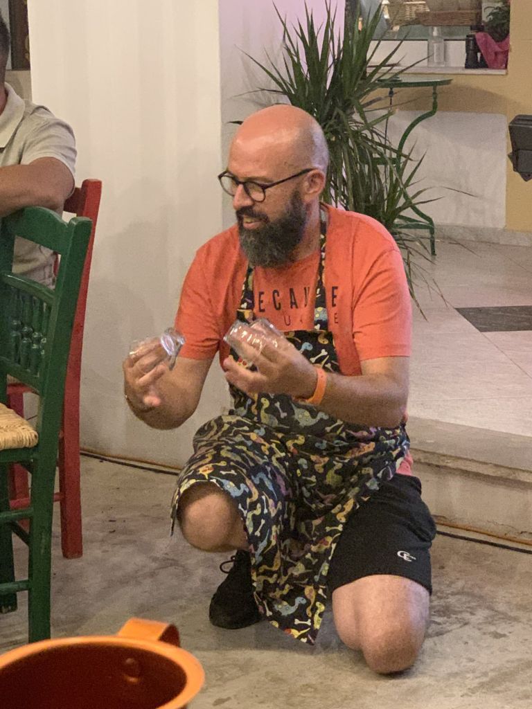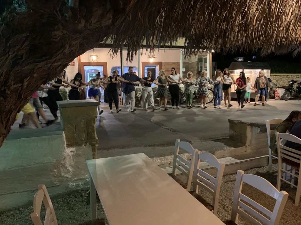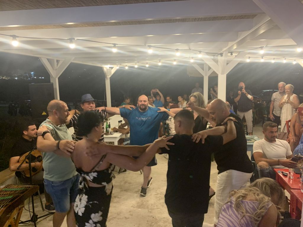Die Anwesenden, hier ausnahmslos die Griechen, knien im Kreis, feuern den Tänzer / die Tänzerin an und zerdeppern auch mal das gute Geschirr. Es ist beeindruckend hier dabei sein zu dürfen.