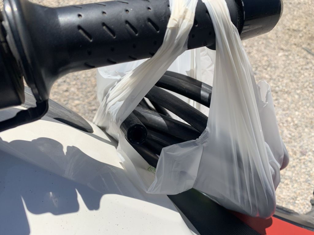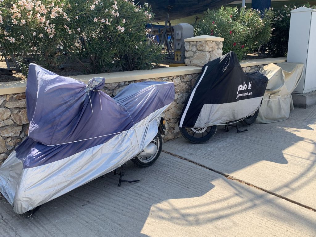 Am Abend dieses Tages erreichen mich Bilder aus Leros. Ein Nachbar hat den gleichen Motor wie ich und offensichtlich ein Problem mit einem zwar leichten, aber latenten Ölverlust. Er versuchte der Sache mit einer Plastikhülle entgegenzutreten…