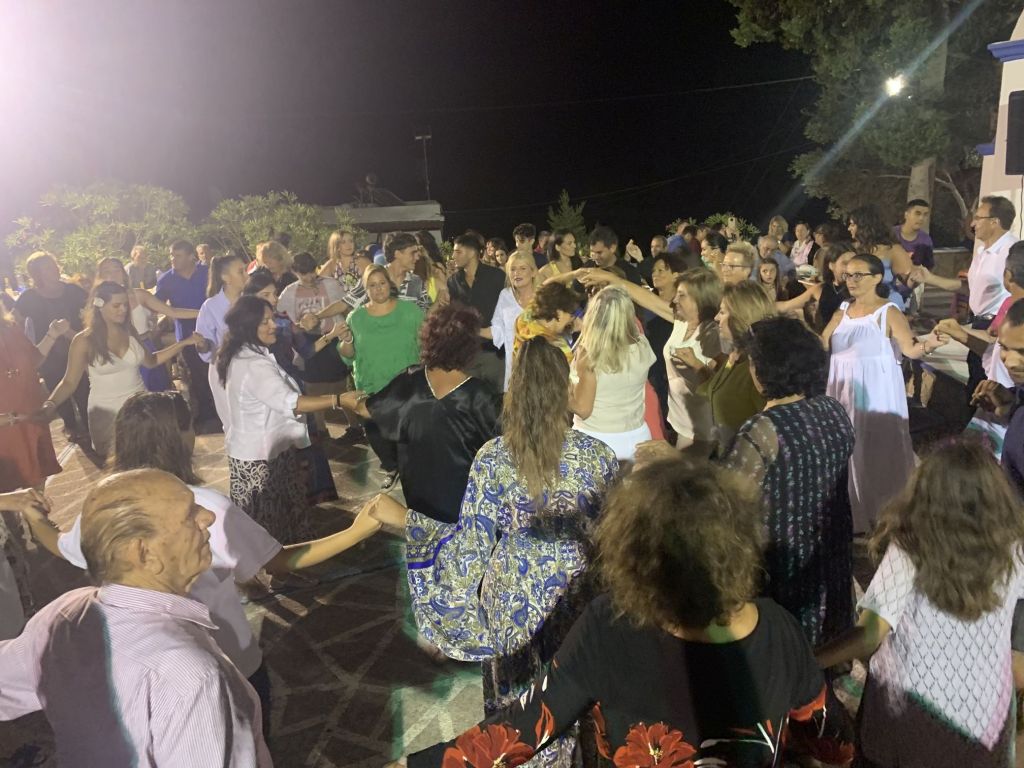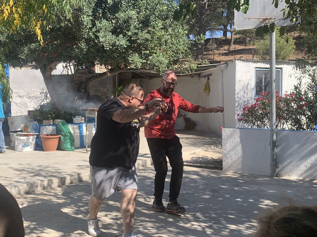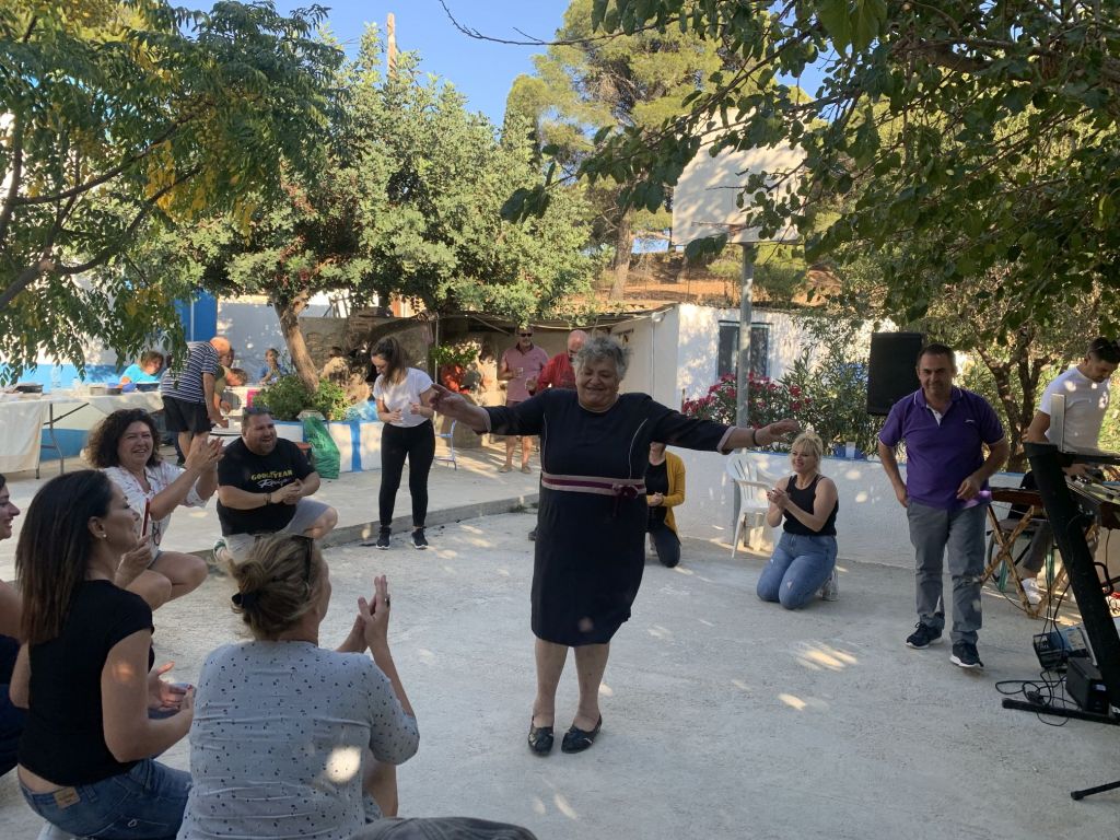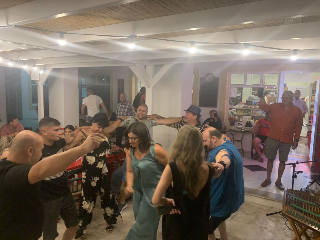 Später, die Feier war in vollem Gange, kam Mariettas Mutter vorbei. Sie ist die Besitzerin des alten Hauses in dem die Feier stattfinden durfte. Die Dame ist betagt, hat aber neugierige Augen – und sie ließ es sich nicht nehmen, einen Tanz auf´s Parkett zu legen. Einen Einzeltanz, einen Ausdruckstanz – Zeibekiko – in dem vornehmlich die alten Männer, hier eben die Hausherrin, die Last und Erfahrung des (langen) Lebens zum Ausdruck bringen. Ein Gänsehautmoment!