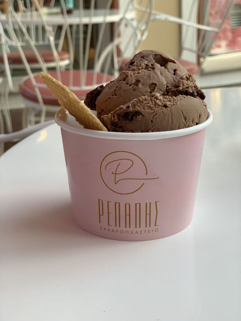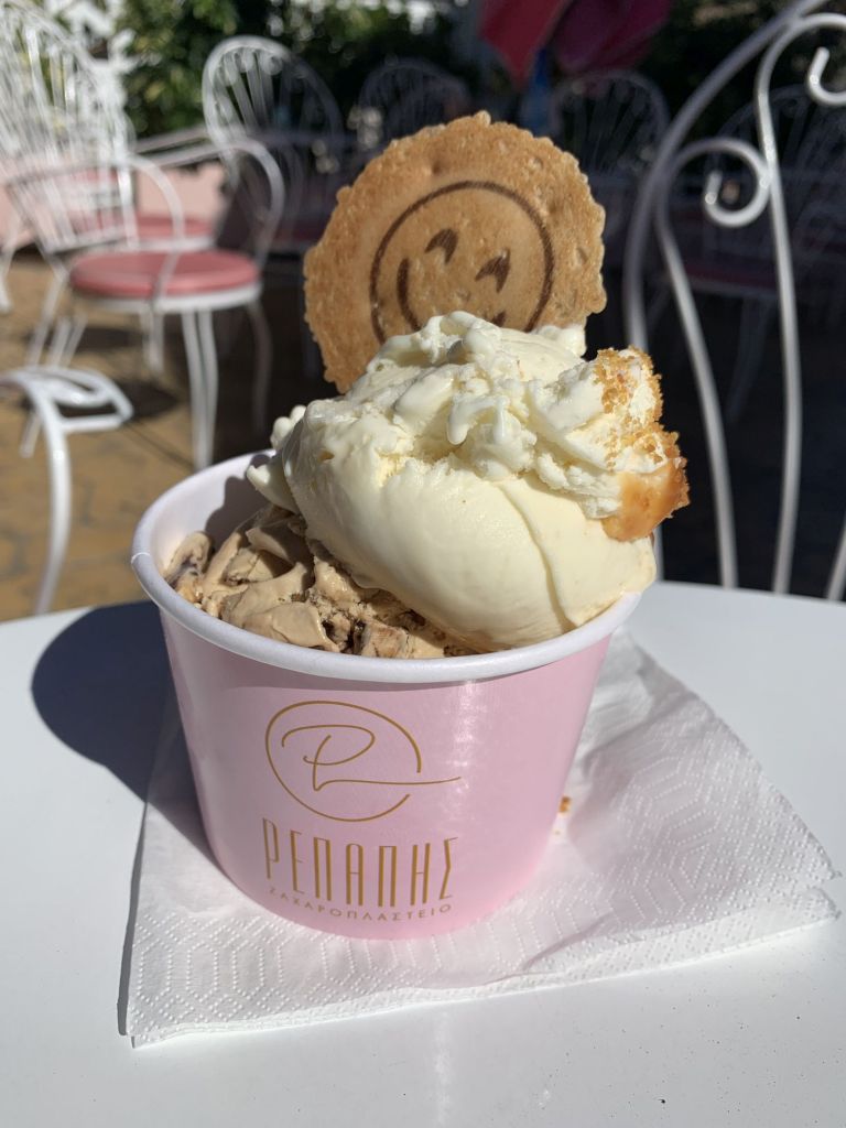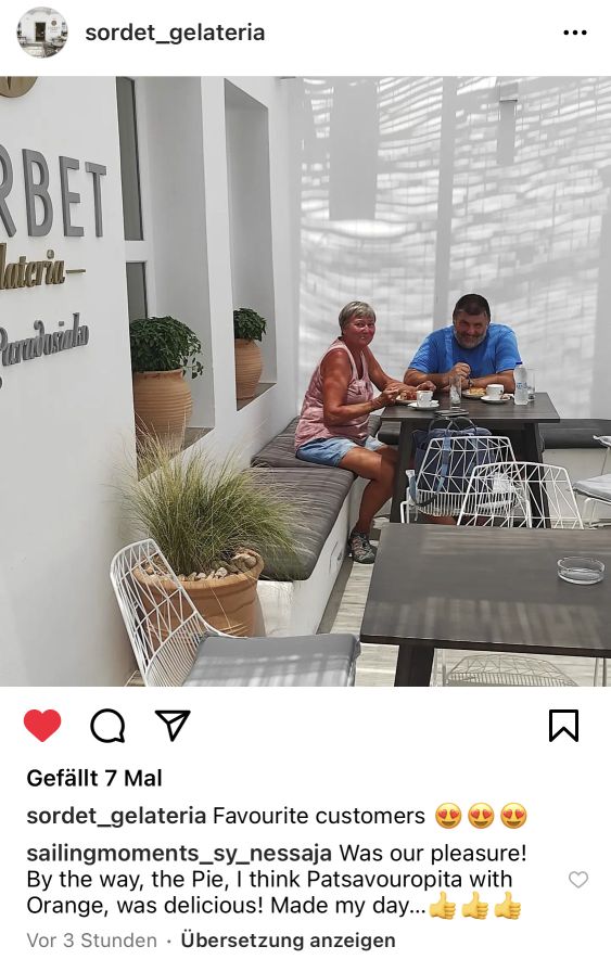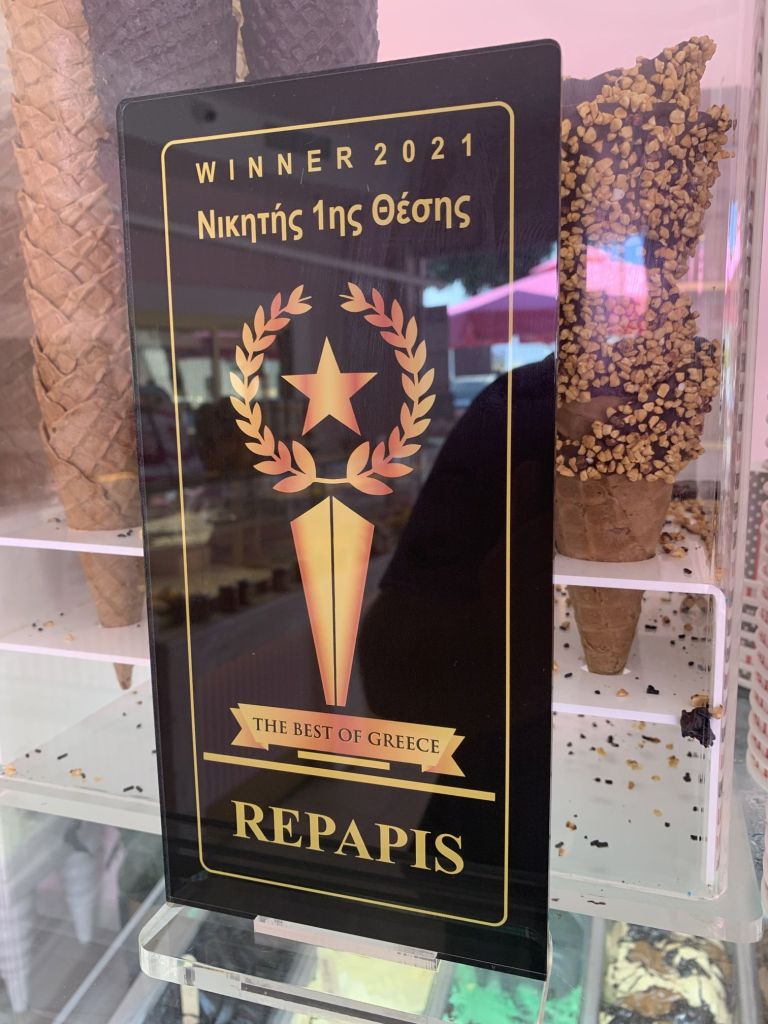 Unser Gefühl, dass das Eis bei Repapis schon ein sehr gutes ist wird bestätigt – durch ein Schild, welches seit unserer Rückkehr am Tresen steht. Man ist stolz und zeigt das – Bravo.