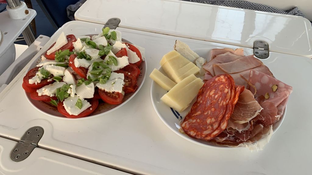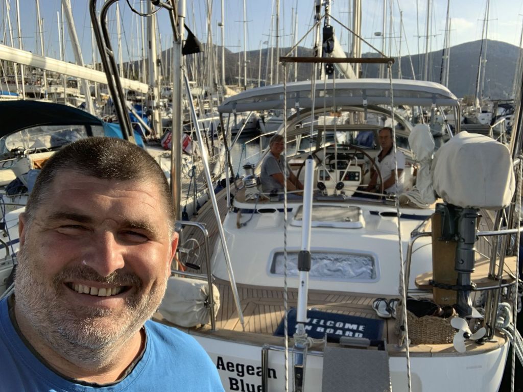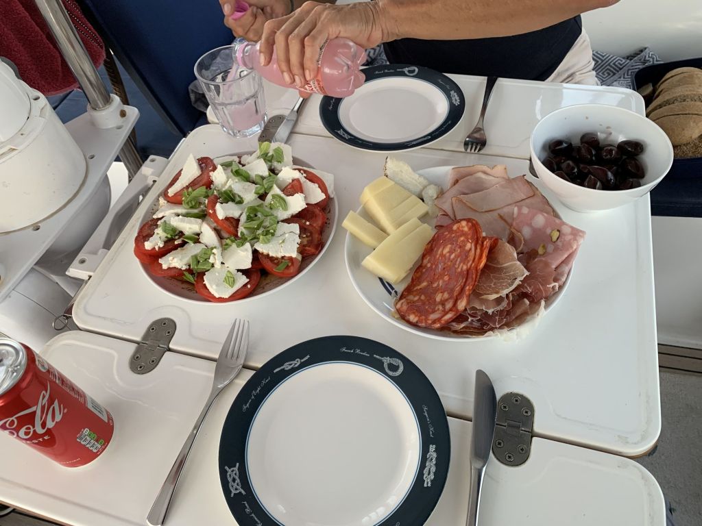 Wir fahren zurück in die Marina, gehen duschen und treffen rechtzeitig auf der AEGEAN BLUE ein, dort waren wir zum Apero geladen.