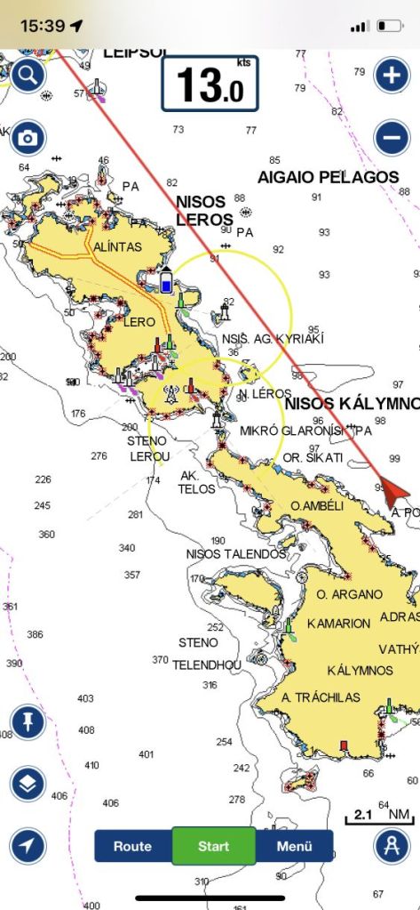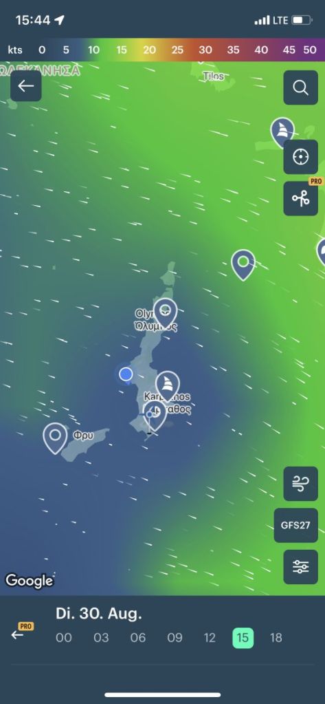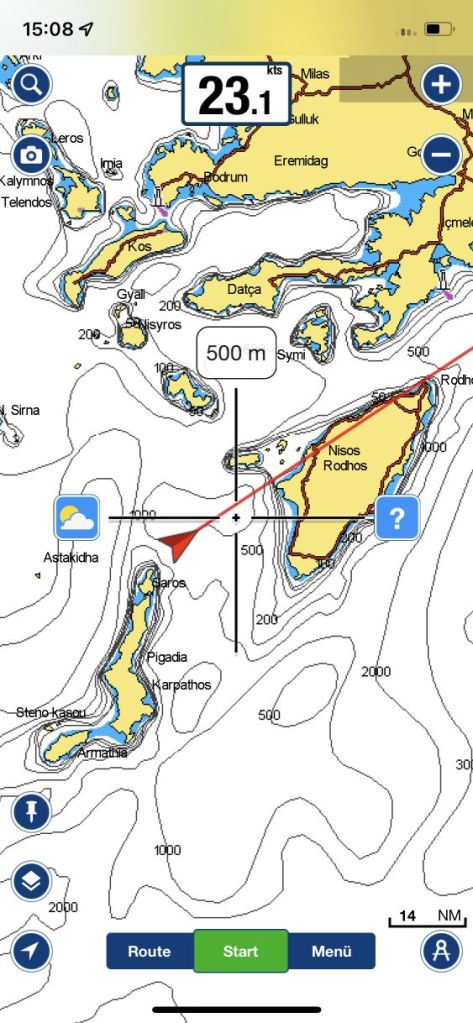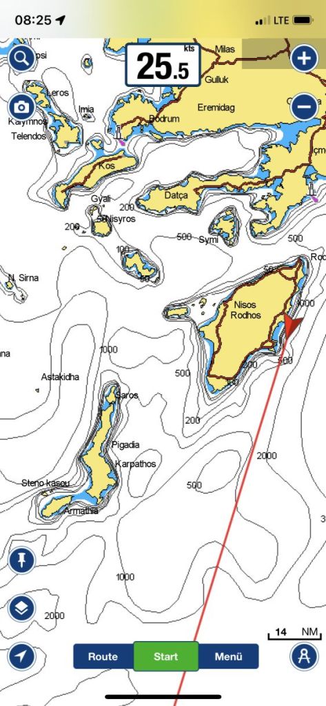 Der zweite Grund – und das ist mein Ernst – ist der, dass hier in der Marina immer wieder diskutiert wird, wie zu handeln wäre, wenn der osmanische Nachbar seine Drohungen ernst macht und die Dodekanes Inseln annektieren würde? Das glaubt zwar niemand ernsthaft, dennoch ist es in der heutigen Zeit ein nicht unmögliches Szenario – ich möchte dann zumindest nicht mit leerem Tank dastehen.