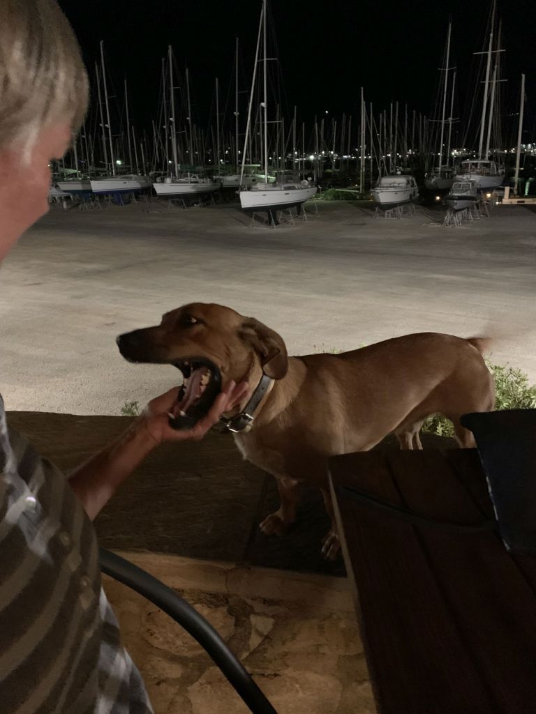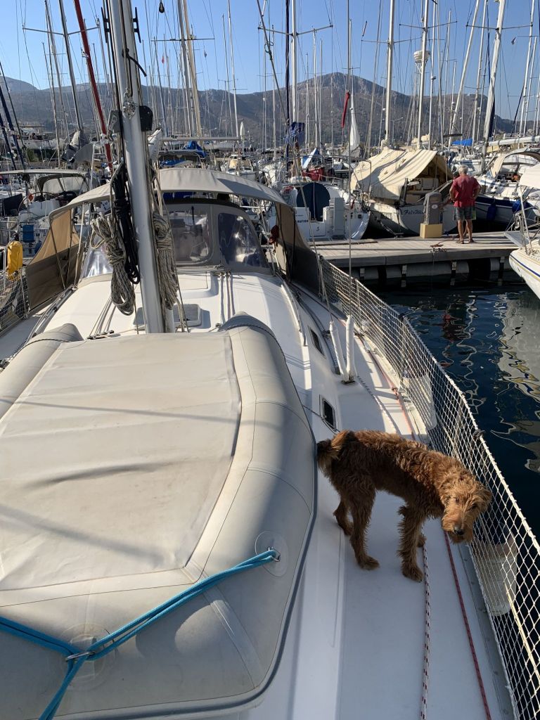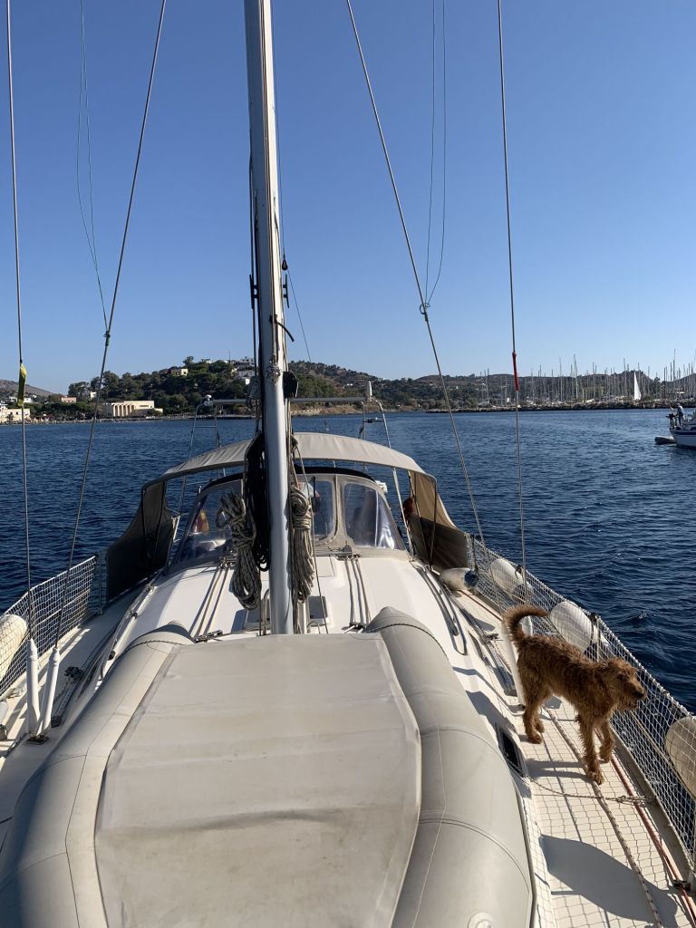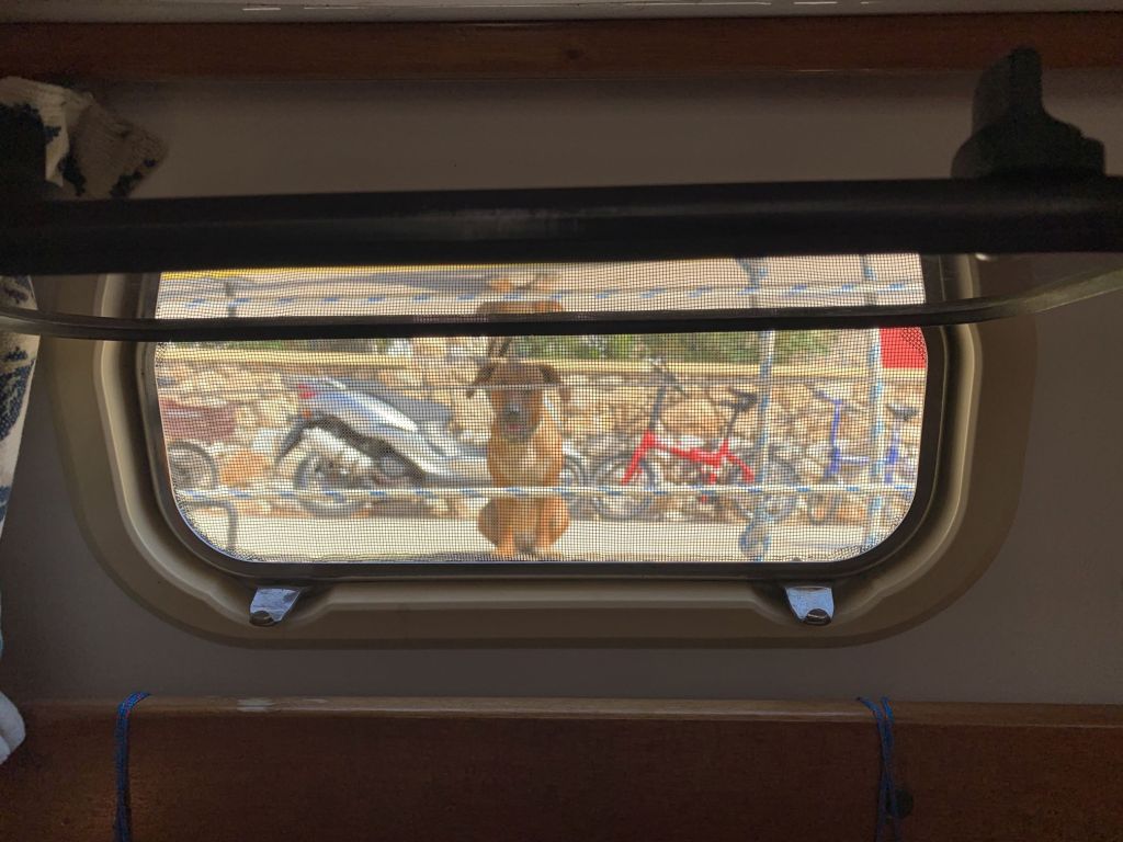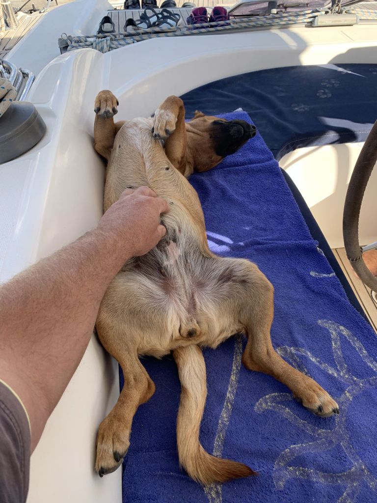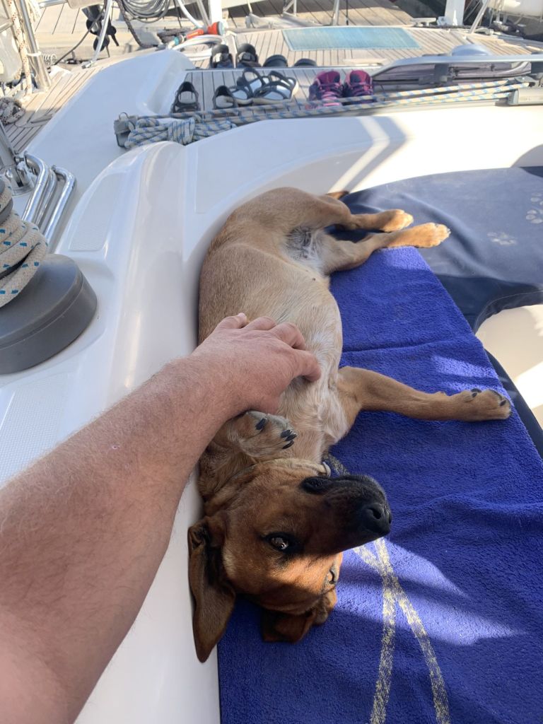 Inzwischen kann ich mich mit der Frage beschäftigen, ob es eine gute Idee war, dem Marinahund Electra beizubringen, wie sie unser Schiff entern kann. Kaum verstanden, dass die wacklige, weil schwebende, Brücke keine Gefahr darstellt, hat sie sich ihren Platz gesucht und ein paar Streicheleinheiten abgeholt. Die weiß eben wie es geht…
