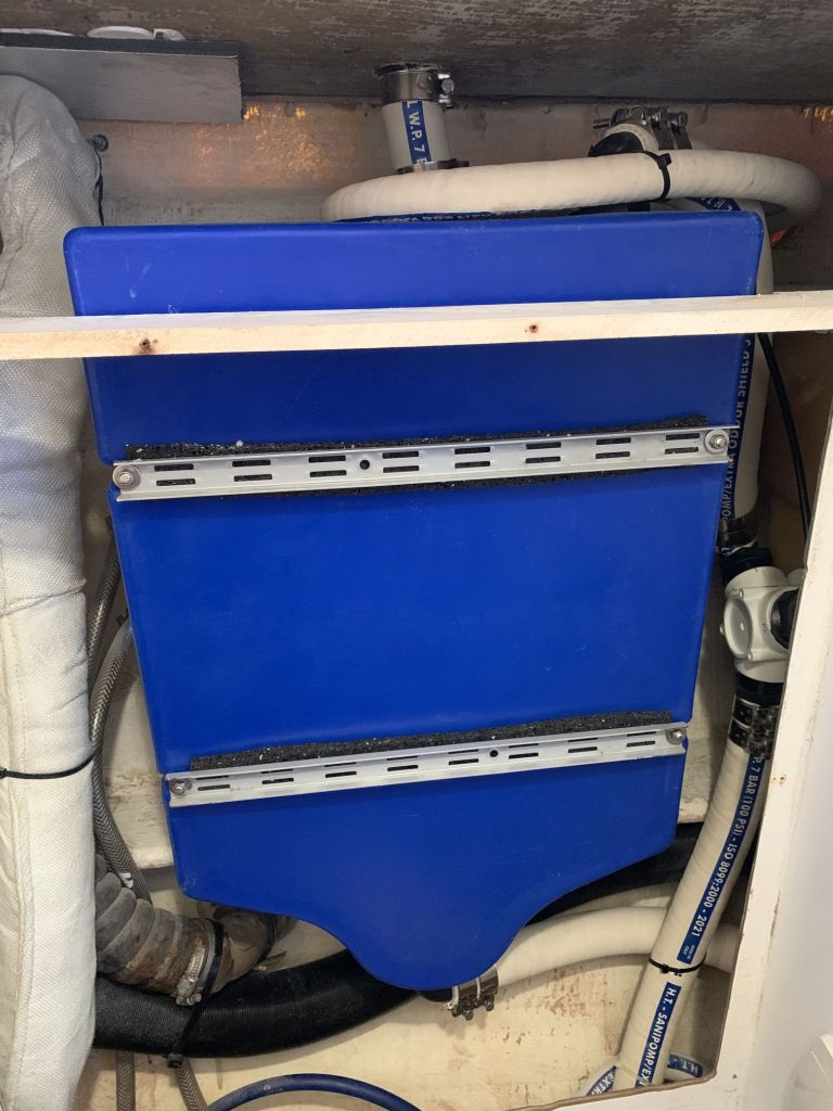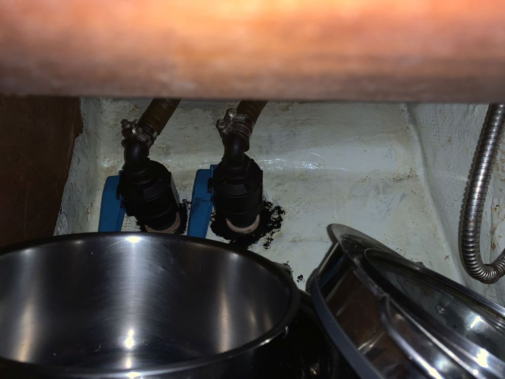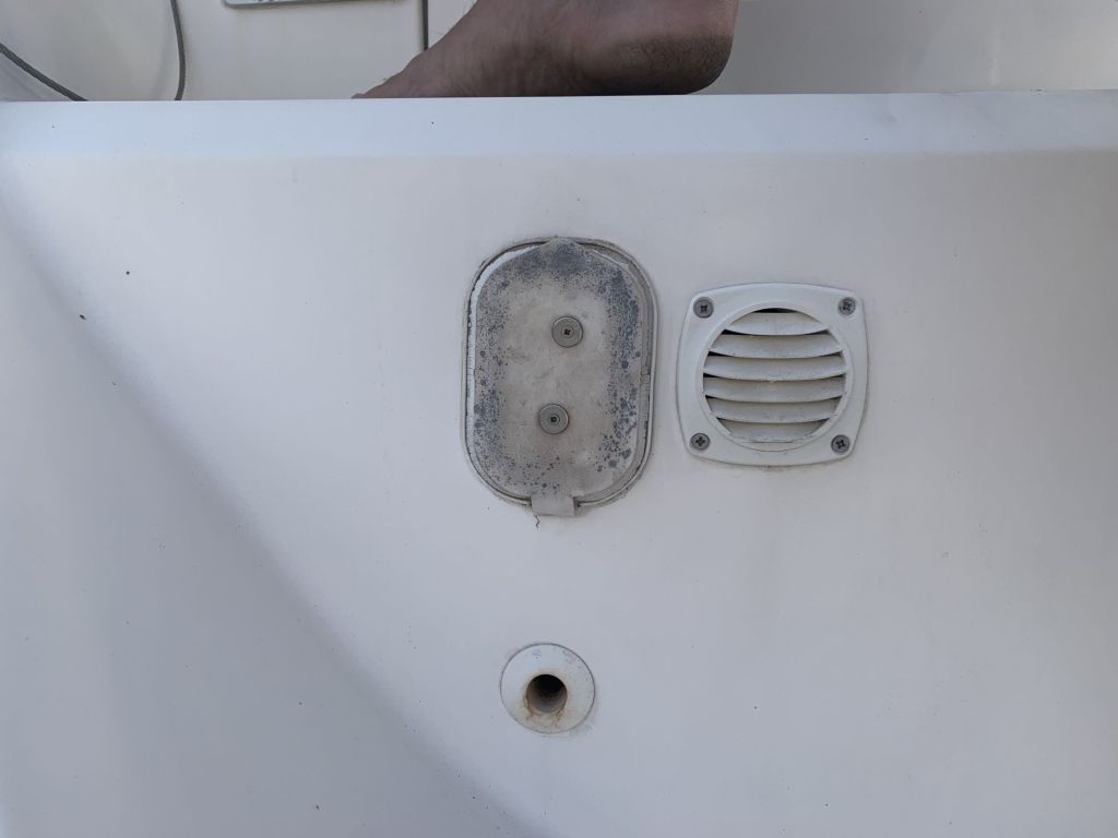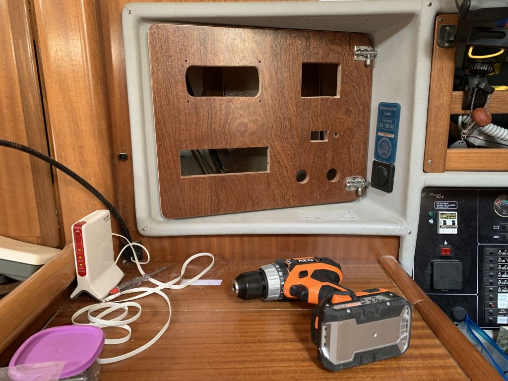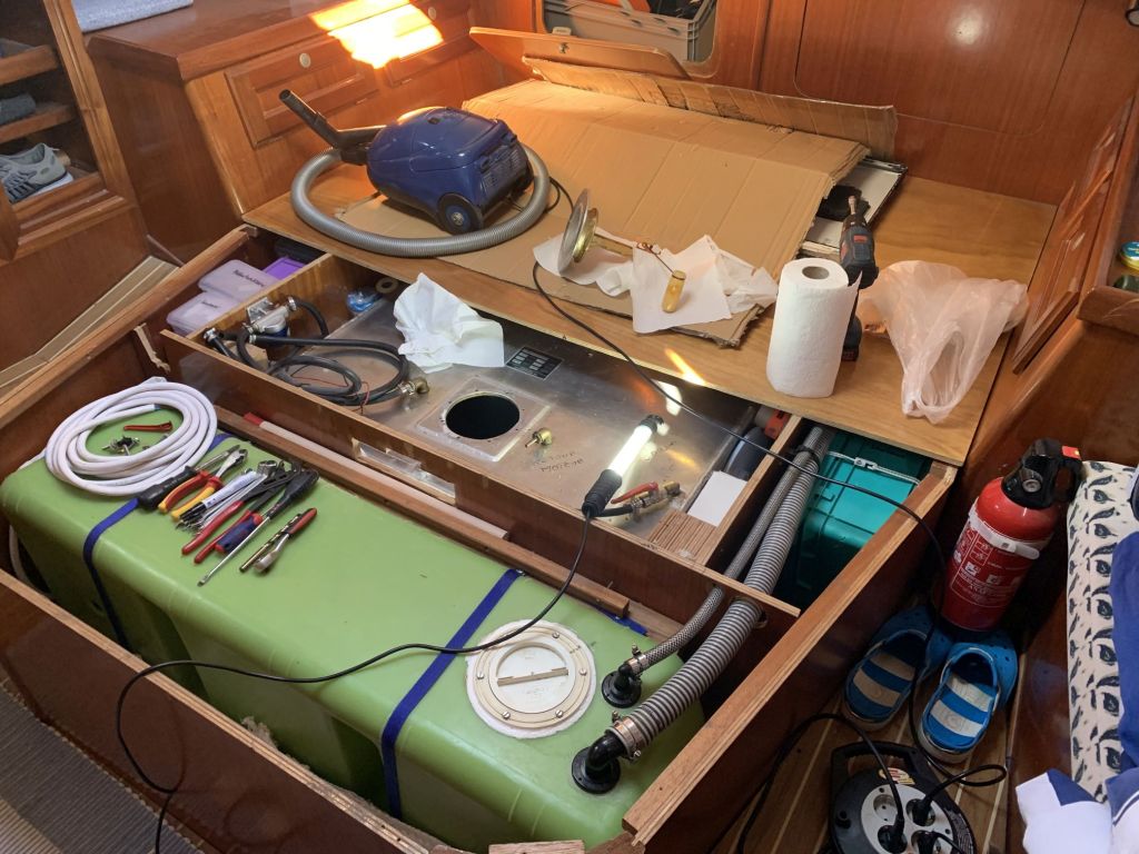 Soweit der Plan – offen gesagt, hinter der Klappe ist es jetzt noch leer. Ich werde die Wasseranschlüsse an einem Regentag umbauen, es ist dann eine Arbeit in der Backskiste.