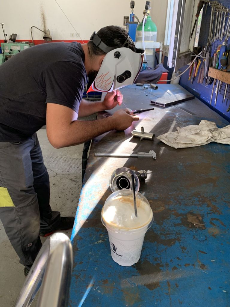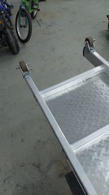 Die Leiter, die Basis des DIY Produktes, musste also zum Schweißer um dort die ausgeschlachteten Räder und eine Base für den Haltepin anschweißen zu lassen.