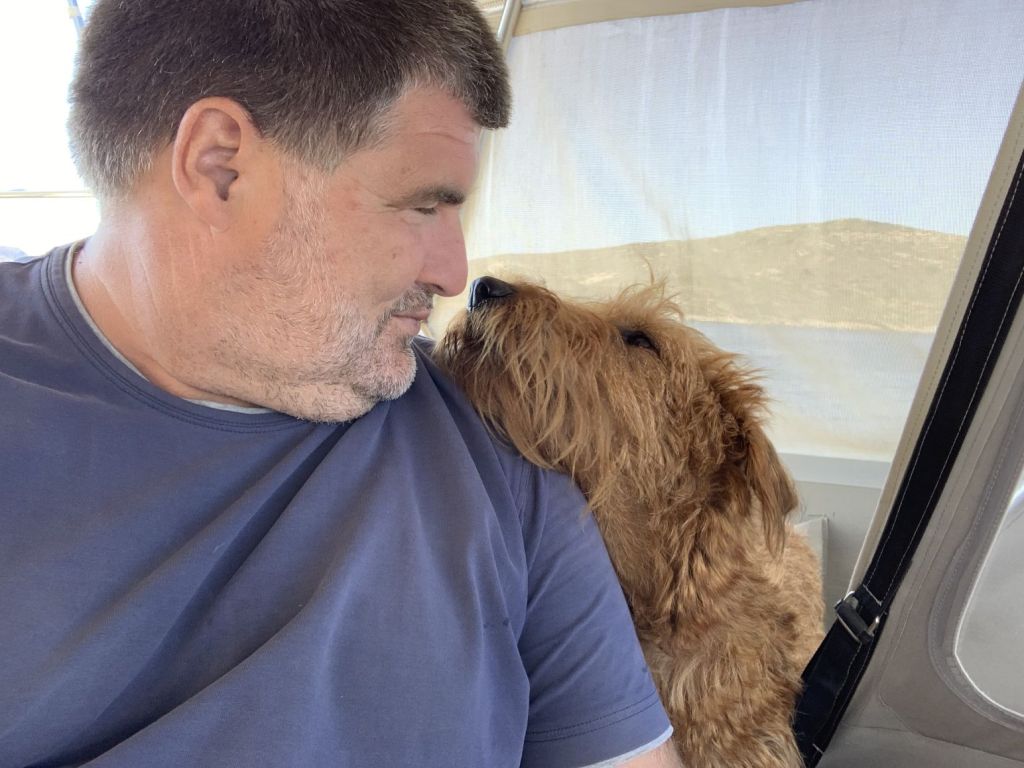 Merliiiiiiiin, is des down? (Der Hund kann nämlich Englisch), soll de Hund hinne odder hause hogge? Ja kennds eich jetz amoi olle hisetzn? Sehr lustig bei uns an Bord – Leinen los!