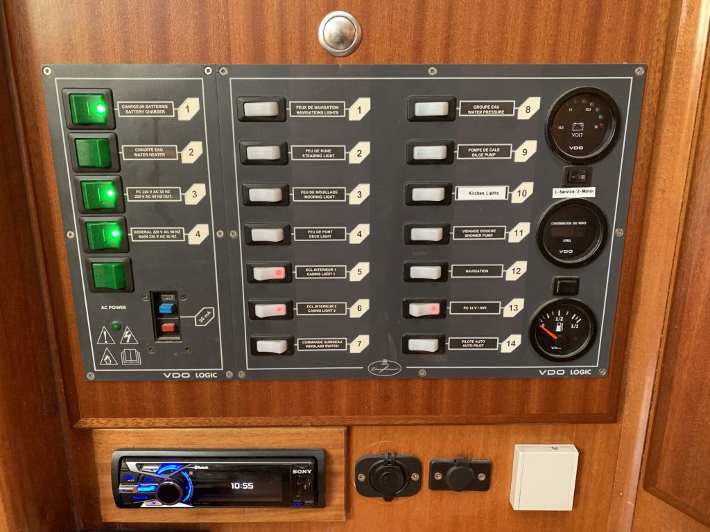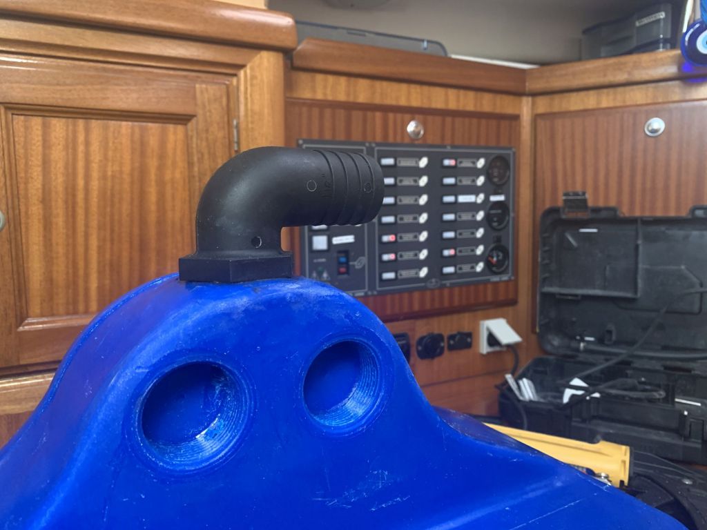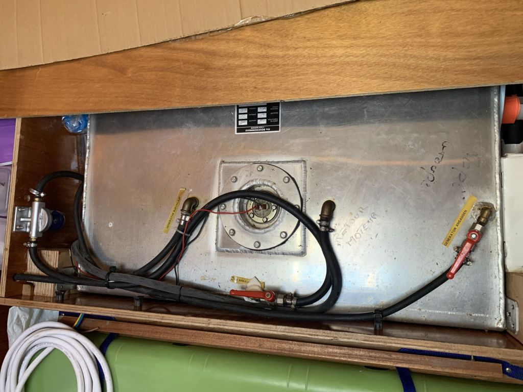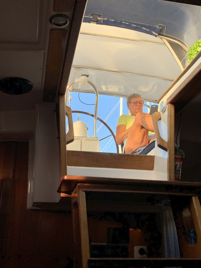 Sibylle und ich bauen alles wieder zusammen, machen sauber und lüften. Wir tanken exakt 20 Liter und starten den Motor der einwandfrei läuft. Wir lassen den Jockel 10 Minuten in die Heckleinen eindampfen und prüfen die Dichtheit des Leitungssystems – alles top!