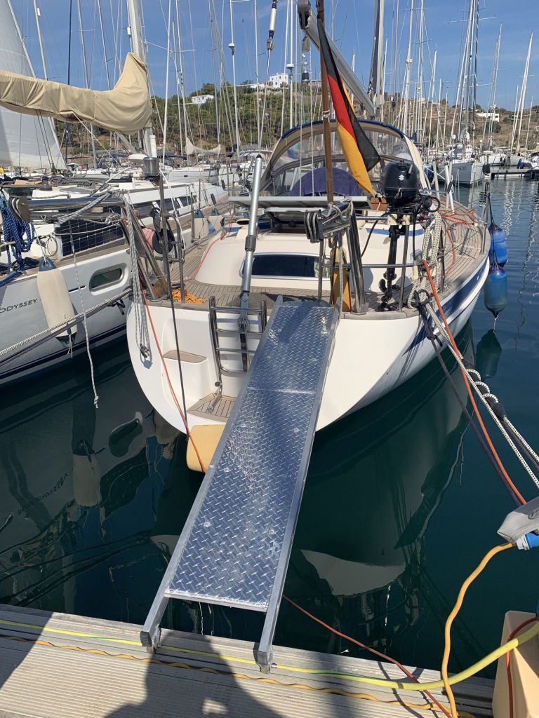 Um zu verhindern, dass Werner wegen seiner beschädigten Gangway ins Wasser fällt, musste Ersatz geschaffen werden. Werner und ich hatten vereinbart, an dieser Stelle keine 800.-€ zu investieren, sondern die Landbrücke aus einer Leiter selber zu bauen. Aber wie kommt Werner dann an und von Bord?
