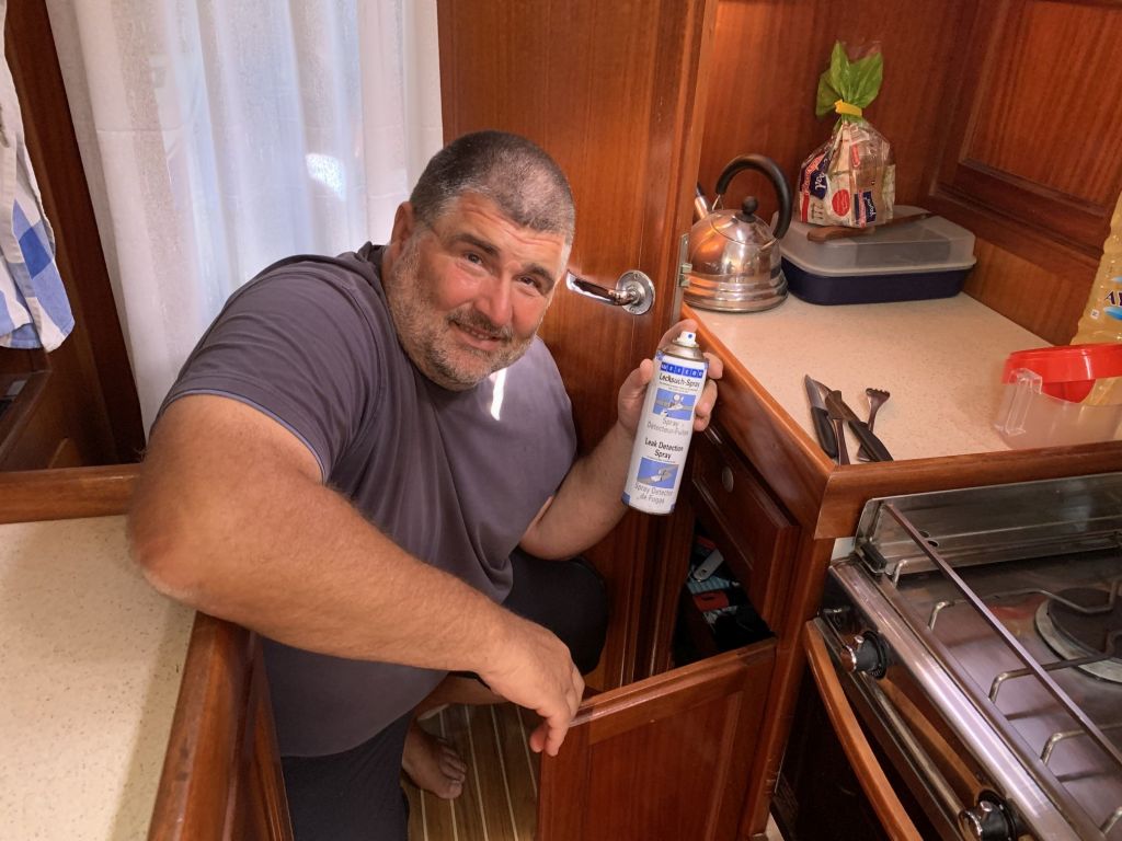 Da ich ja die ganze Anlage erneuert habe und auch nach deutschen Vorschriften aufgebaut habe, kommt prinzipiell kein Zweifel an der Dichtheit des Systems auf. Eine Gasprüfung gibt es aber in Griechenland nicht – so greife ich, der Sicherheit halber, nach dem Lecksuchspray und mache mich auf den Weg um eine Schlauchverbindung nach der anderen auf Dichtheit zu testen. Sieht aber alles gut aus!