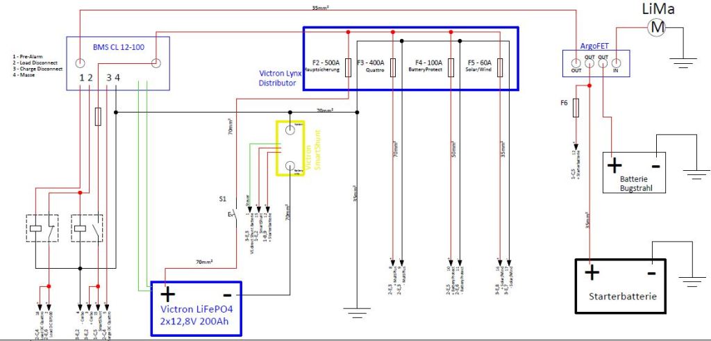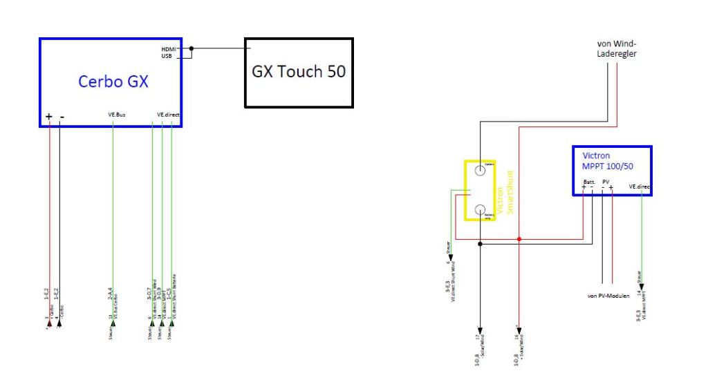 - Einbindung der Lichtmaschine und des Generators in das Gesamtsystem, alles mit den entsprechenden Victron Bauteilen