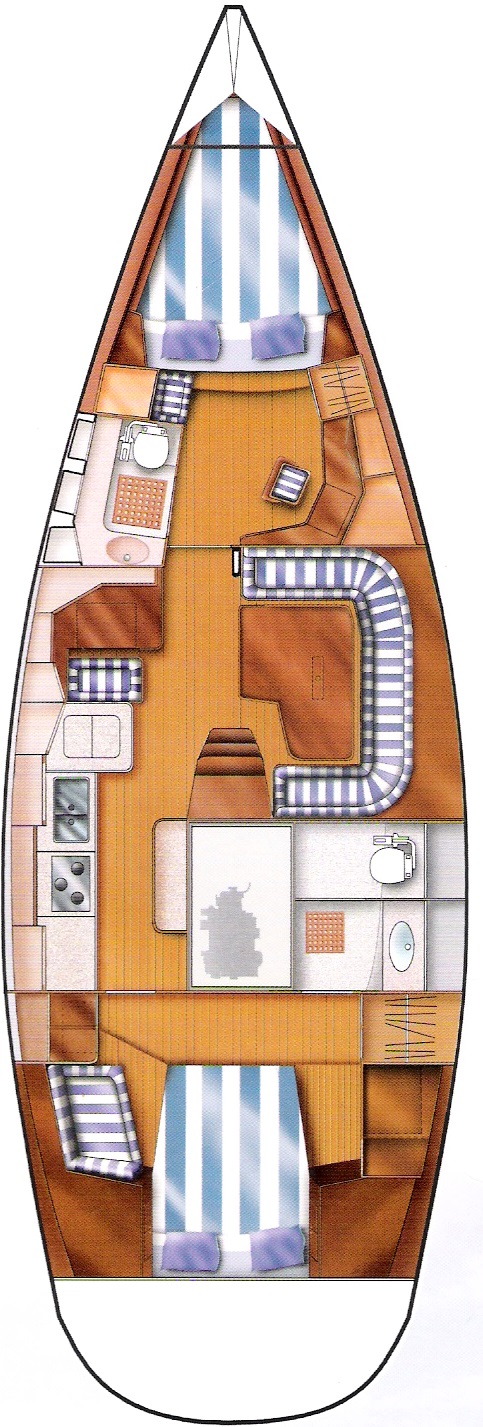 Kompromisslos auf Raum und Platz gezeichnet bieten sie dem Eignerpaar und einem weiteren Mitsegelerpaar großzügigen Lebensraum. Der gravierende Unterschied zu unserer Bavaria ist die lichte Höhe über dem Bett in der Achterkabine, die abgetrennte Dusche im Eignerbad und die riesige Gästekabine im Bugbereich mit eigener Dusche.