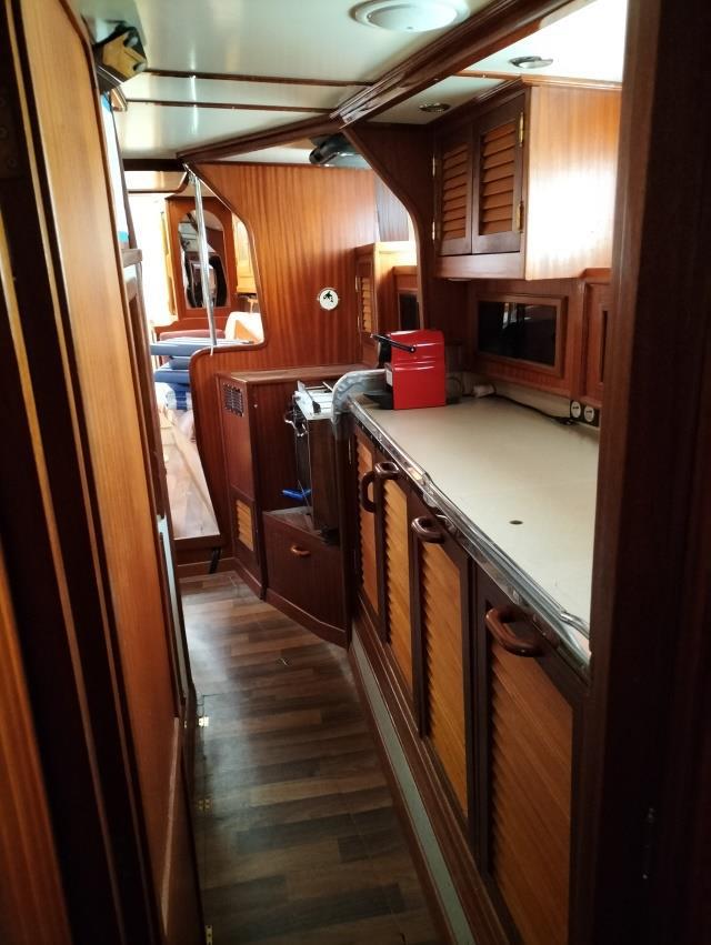 Verlässt man das Schlafgemach der Eigner wieder, blickt man entlang der Kombüse auf der Steuerbordseite des Schiffes durch den Salon bis nach vorne in die Bugkabine.