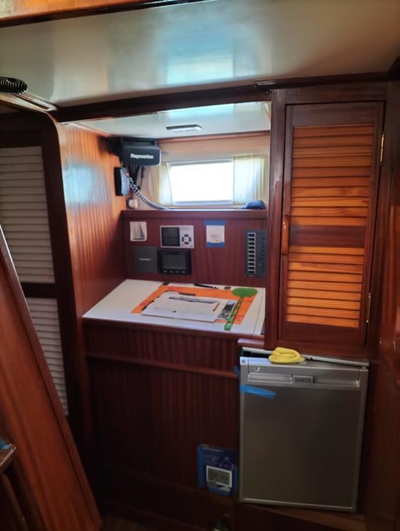 Um ein vollumfängliches Bild der Pantry zu haben, müssen wir noch kurz auf die andere Seite sehen, also die Backbordseite in Fahrtrichtung. Hier fügt sich zwischen Salon und der Türe zum Badezimmer ein Navigationsplatz und der Kühlschrank ein.