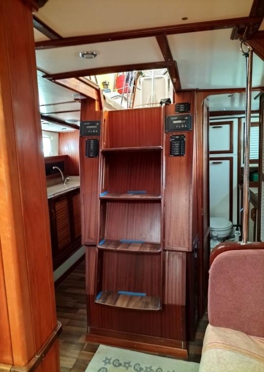 Wir stehen im Salon und blicken auf dem Bild nach achtern – in diese Richtung gesehen ist rechts das Badezimmer und links die Pantry – der Durchgang ist gleichzeitig auch der Weg in die hintere Eignerkabine.