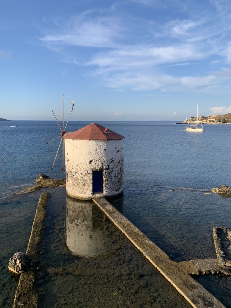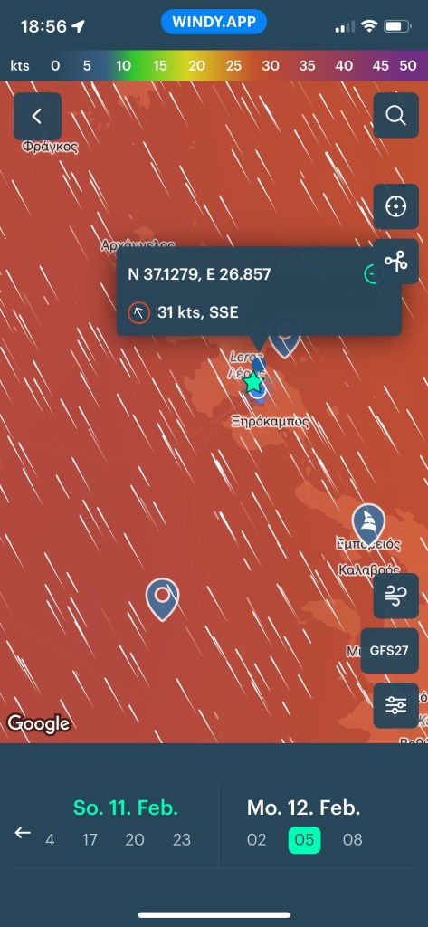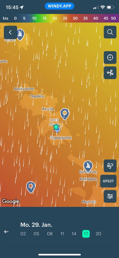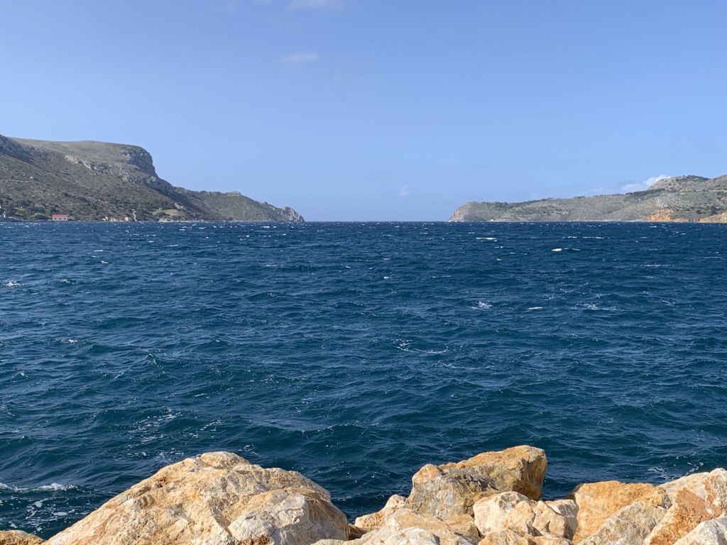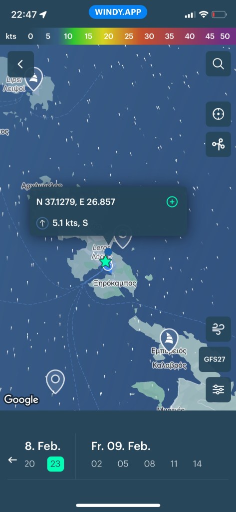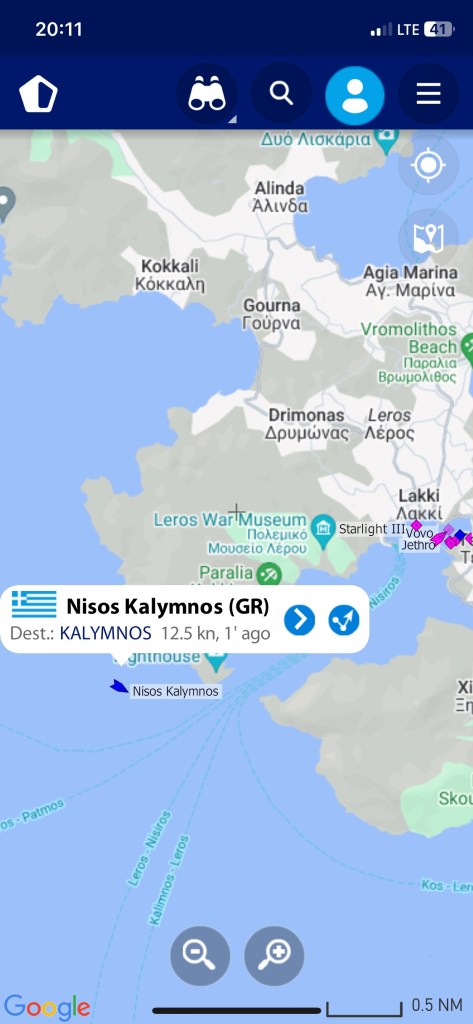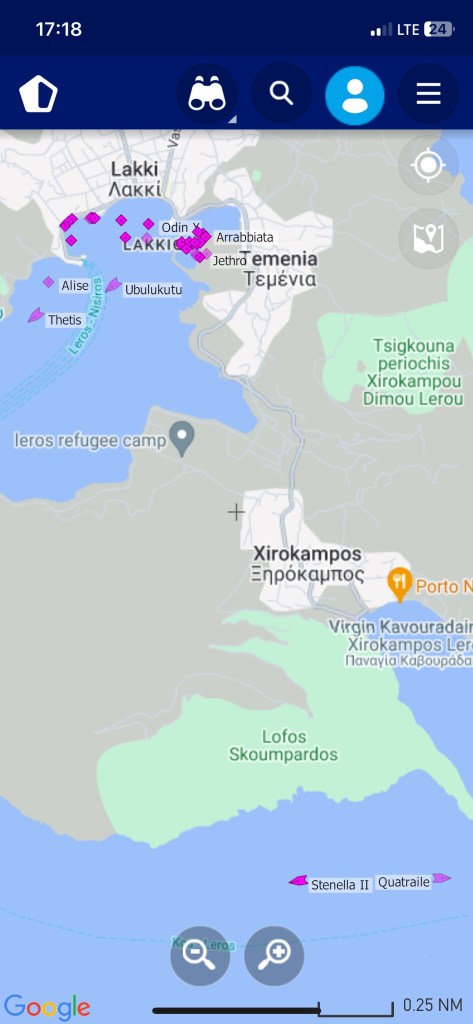 Die SAGITTA mit Crew Mario und Eva an Bord, verweilt noch in der Südbucht von Leros. Wir wollen sie noch einmal besuchen und machen uns daher auf den Weg nach Xirokampos.