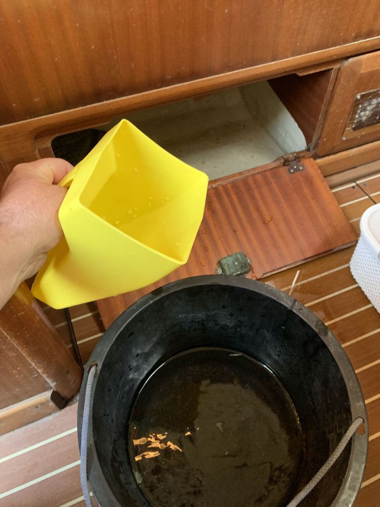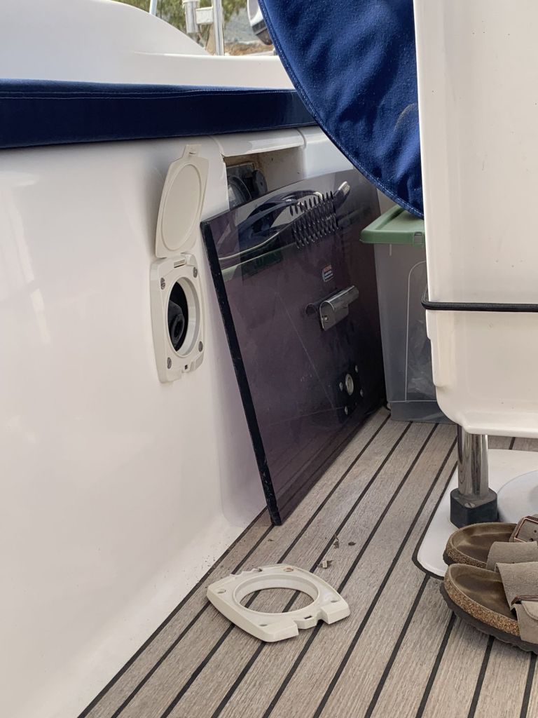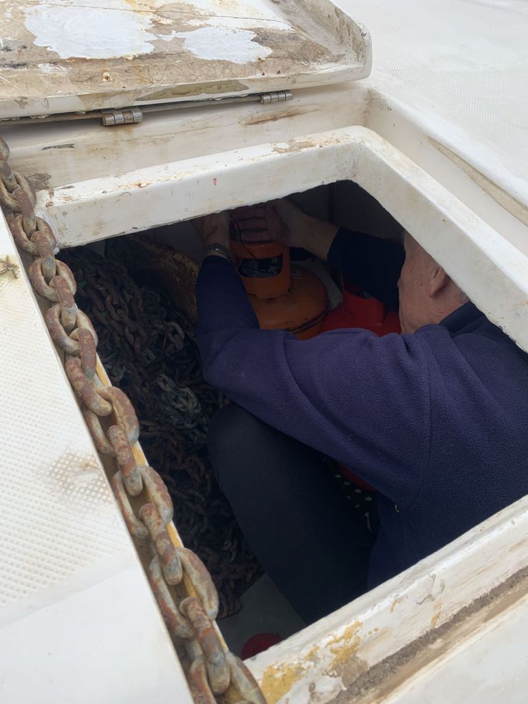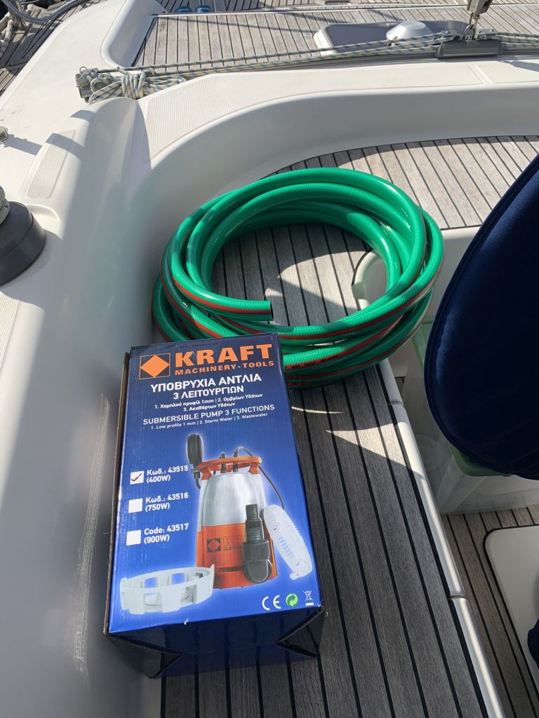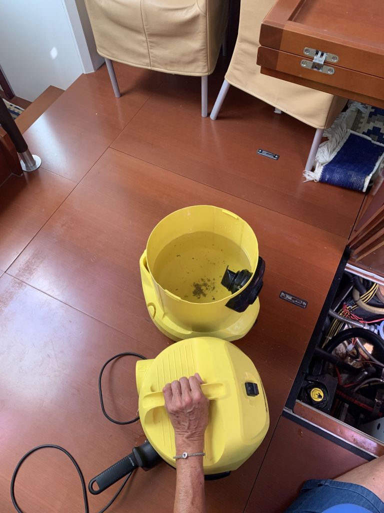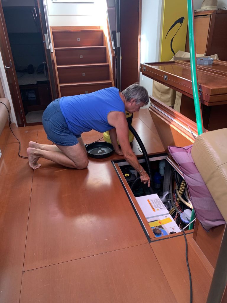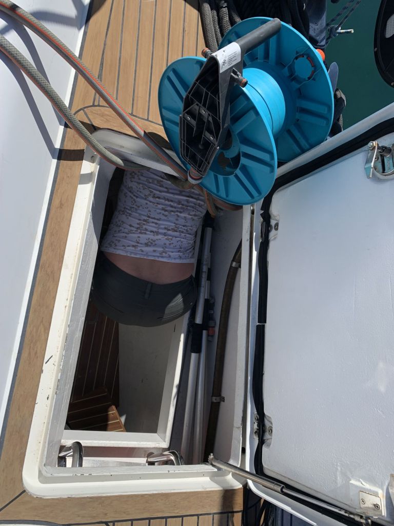 Für mich gibt es an diesem Tag nur noch eine Aufgabe zu erfüllen, EDINA für die Übergabe vorbereiten. Dafür soll ich die große Tauchpumpe aus dem Innenraum nehmen, die Motorklappe schließen und den Schlüssel deponieren sowie ein Brett bereitlegen – ok, das mache ich gerne!