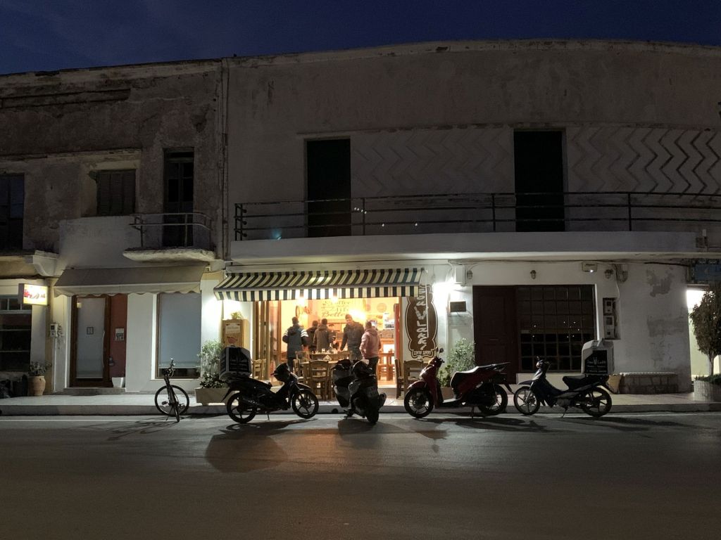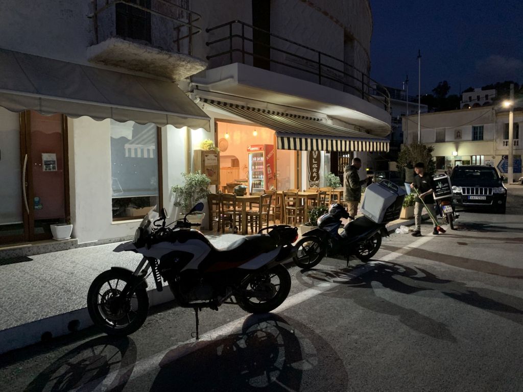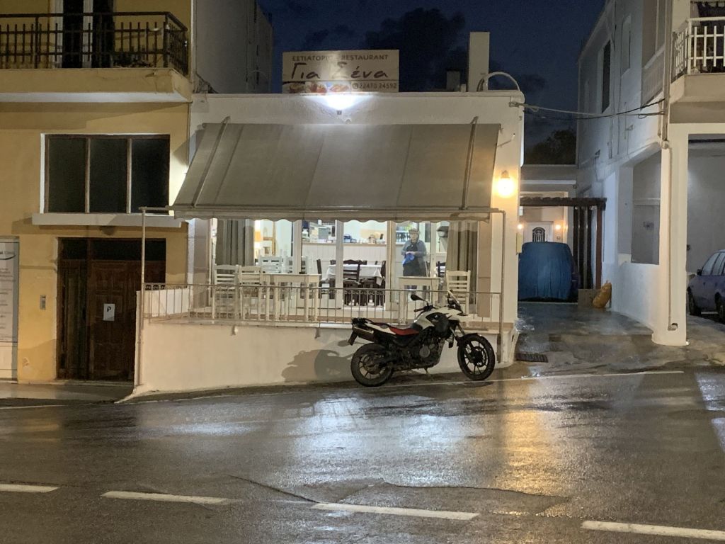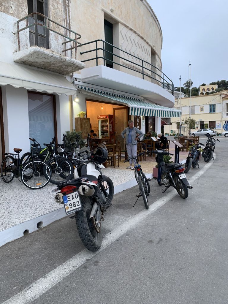 Auch Volker kann seine Pläne verwirklichen – er macht den ersten Stop im „Stigma“ auf Archangelos und sendet Grüße von Giorgos dem Tavernenwirt. Das von uns beworbene „Octopus Tigania“ hat er bekommen – der Tag findet also für uns alle ein versöhnliches Ende.