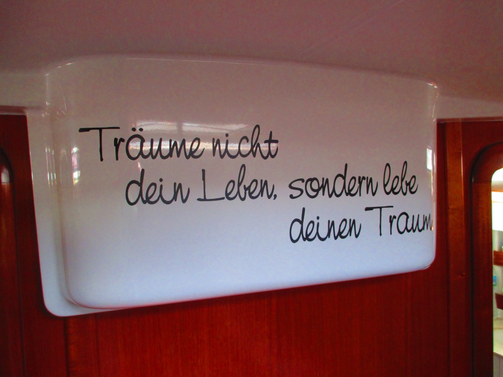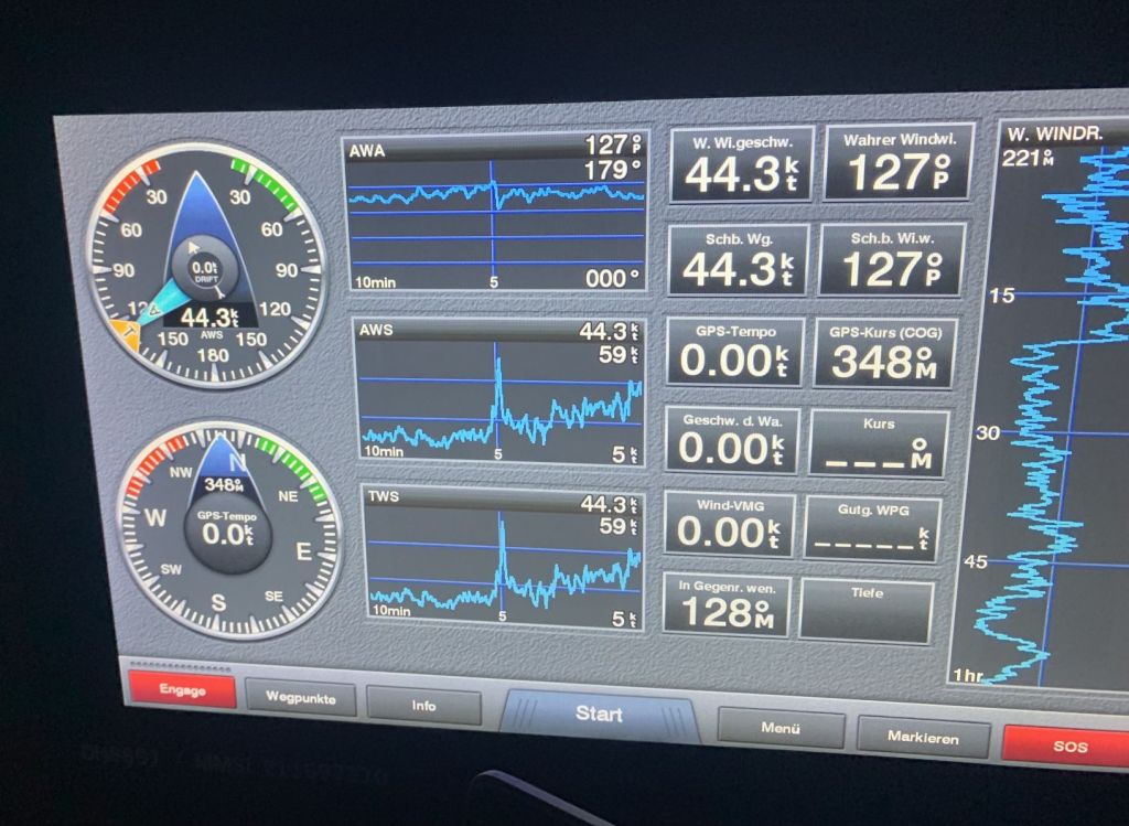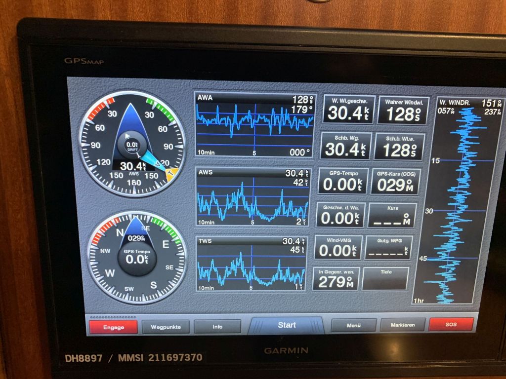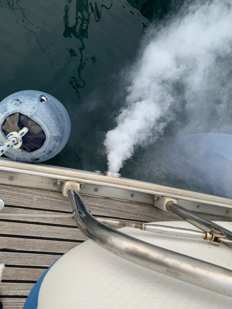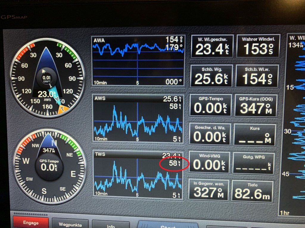 Was ist DAS jetzt??? Was soll das? ELOWYN tuckert wie eine alte Galeere. Sie qualmt und kommt nicht auf Drehzahl – obwohl wir in Sachen Pitch alles getan haben was die Lehrbücher vorgeben und der Logik entspricht – sie verhält sich atypisch. Wir beschließen, den Pitch noch einmal zu verändern – morgen…