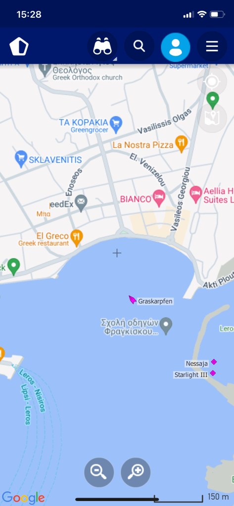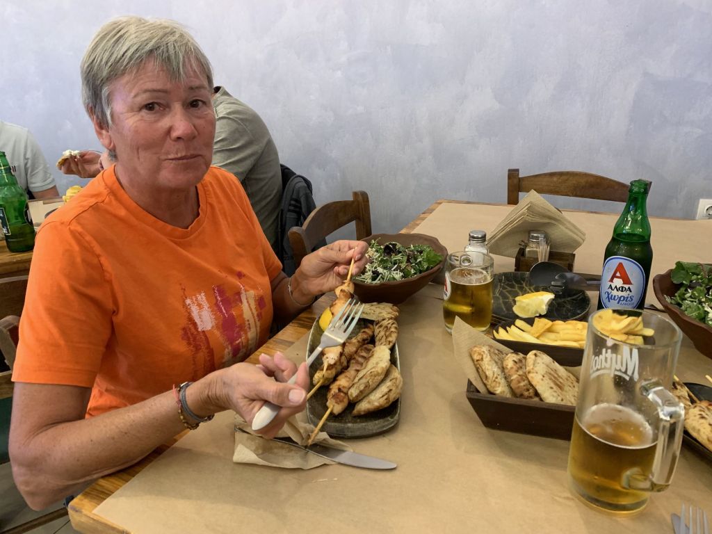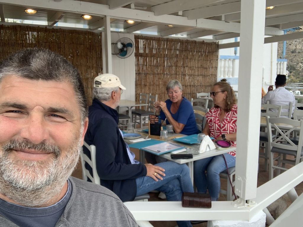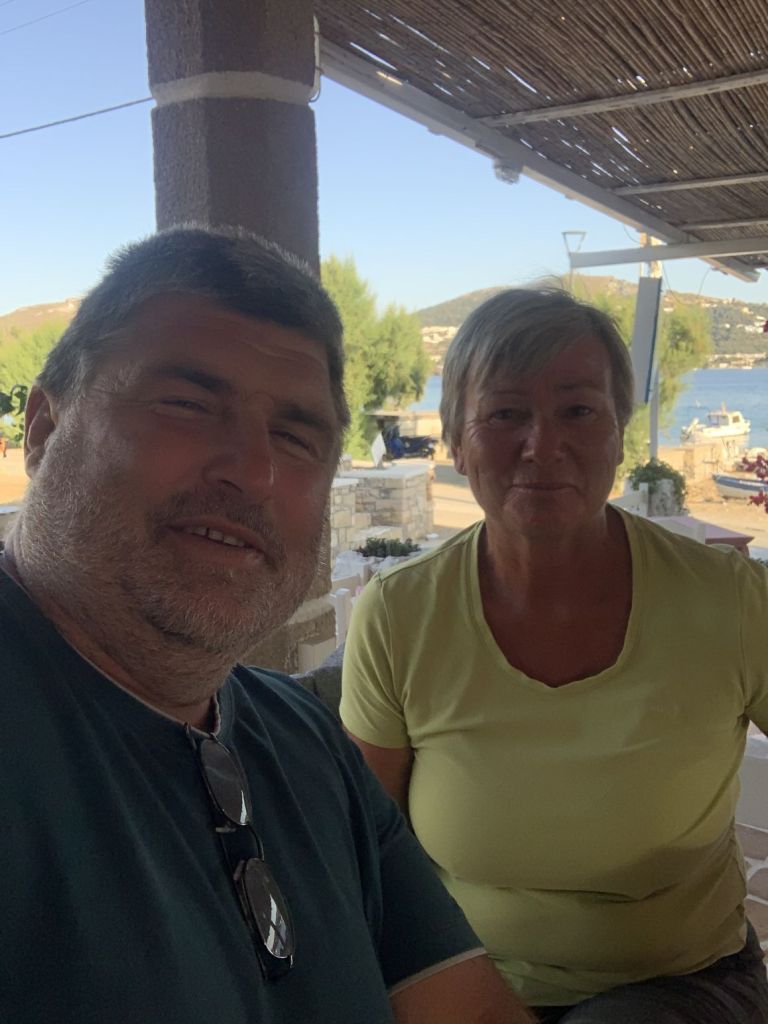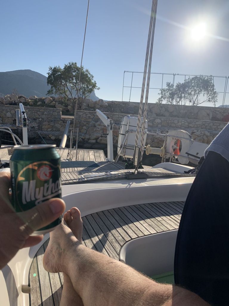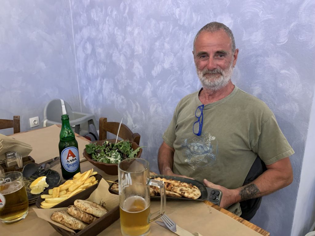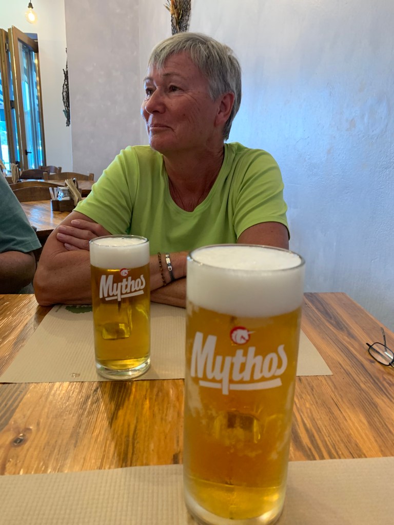 Jetzt aber! Final verabschieden wir uns von den österreichischen Freunden und fahren nach Lakki. Dort waren wir, aufgrund der knappen Zeit, auf einen schnellen Drink mit Heribert von der STARLIGHT III verabredet. Seine vorläufig letzte Stippvisite auf Leros war mit heißer Nadel gestrickt – wir freuen uns daher umso mehr, dass es noch für ein gemeinsames Bier reicht – er wisse noch nicht wie lange er bleibt und ob wir uns nach unserer Rückkehr noch einmal sehen würden. Na dann Prost mein Freund!