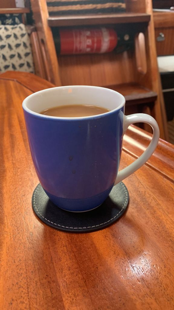 Wir Drei zwängen uns in das federleichte Gefährt, welches durch meinen Zustieg einen Belastungstest erfährt und balancieren uns aus. Wider Erwarten schafft es der Kapitän, uns pannen- und kenterungsfrei zum Mutterschiff zu manövrieren – dort steigen wir um und genießen ein Tässchen Kaffee nebst Kuchenbegleitung.