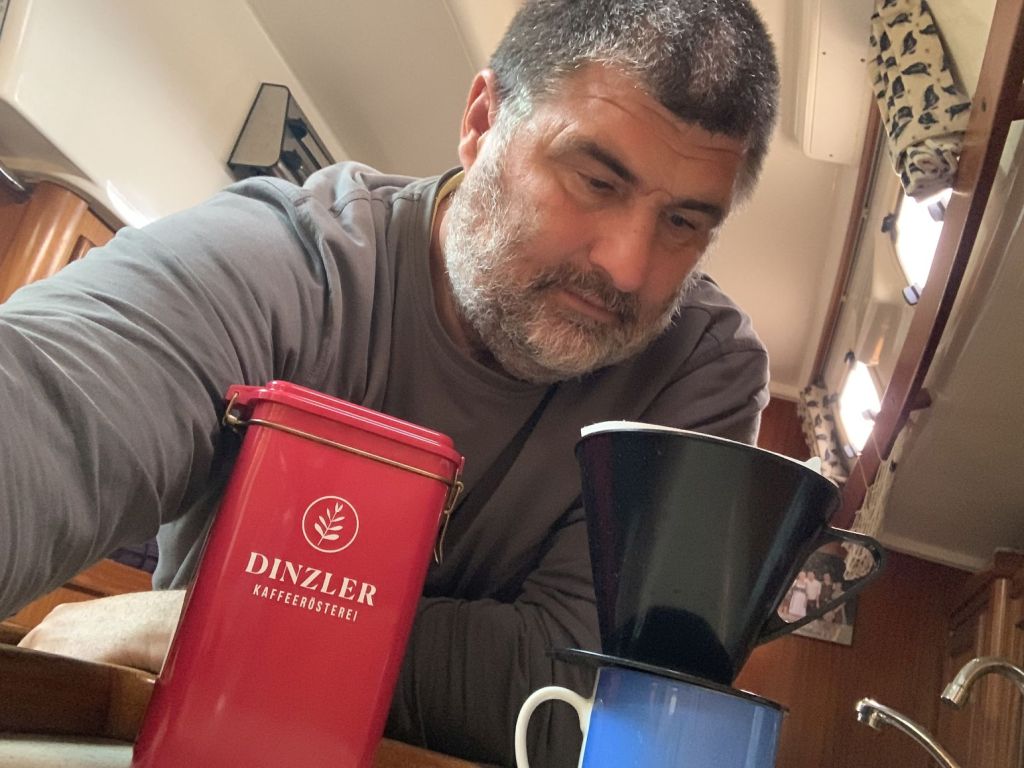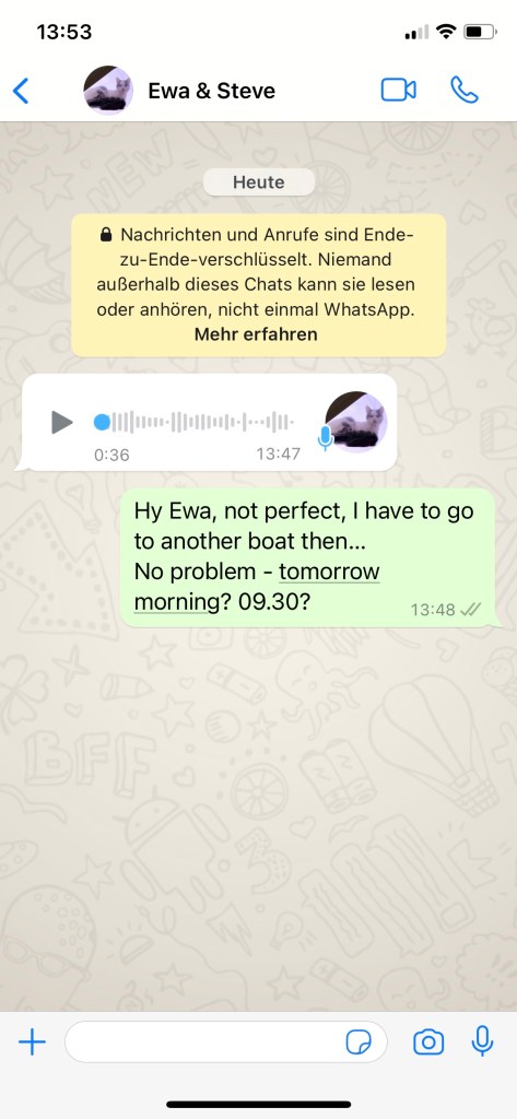 Sibylle ist ungeduldig, das merkt man, wenn sie die Arme in die Hüften stemmt. Wir alle warten auf den Erhalt des Laders, können aber aufgrund des fehlenden Trackings nicht agieren. Wir setzen uns abermals im „Skipper´s“ auf einen Kaffee zusammen, es gilt, einen Sommerliegeplatzvertrag für ELOWYN auszubaldowern, ich muss den Krantermin für ALENA steuern.