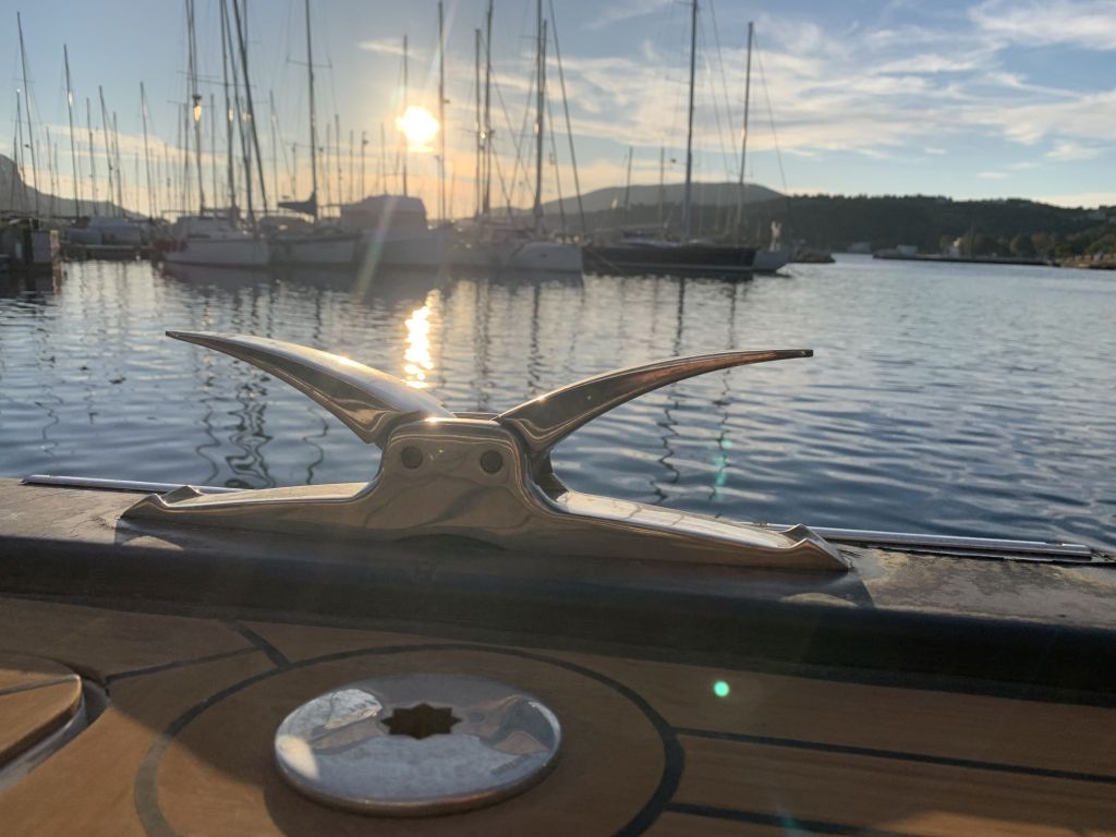 Volker möchte zuvor noch eine Probefahrt bezüglich der Pitcheinstellung machen, wir gehen davon aus, dass alles passt. Danach würde er uns am Steg absetzen und sofort wieder ablegen. Ok, klingt gut – Hans-Peter, Sibylle und ich steigen zu, wir werfen die Leinen los und fahren in die Bucht.