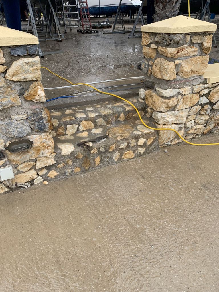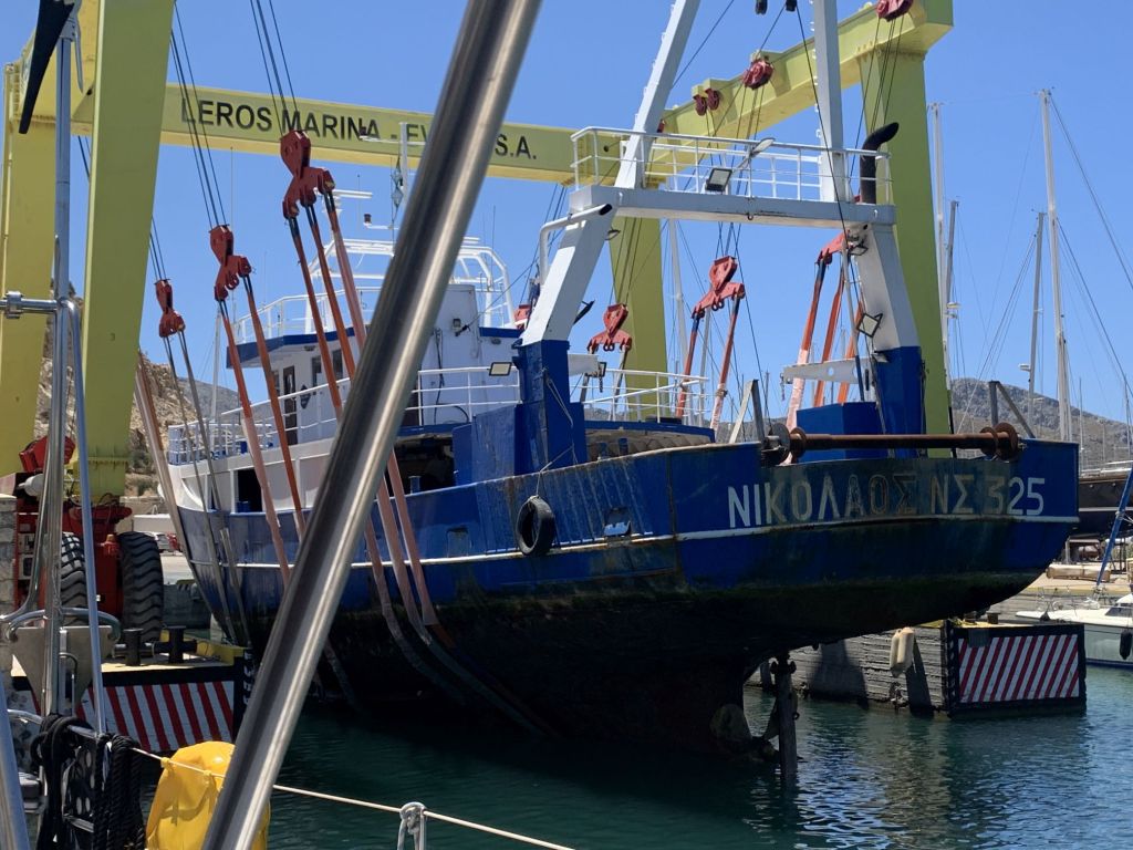 Wir sind auf ELOWYN verabredet – als wir im Cockpit saßen um uns für den Tag zu besprechen, wird ein Fischkutter gekrant. Das mächtige Trum bringt unseren großen Kran an die Belastungsgrenze. Das Berufsschiff muss Ballast ablassen, denn die Notabschaltung des Liftes hatte ausgelöst.