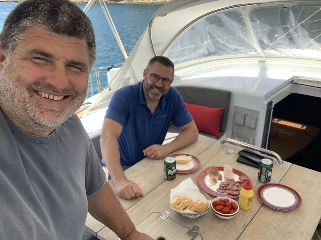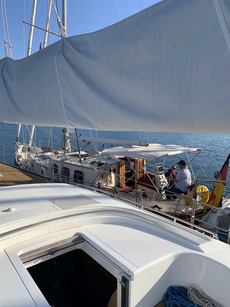 Wir unterhalten uns ganz gut, für mich etwas überraschend, da ja die Gründe für meine Absage, den Verkauf von NESSAJA betreffend, noch nicht ausgesprochen sind. Ich merke natürlich auch, dass die Beiden mit angezogener Handbremse sprechen, wenn es um ihre Kaufabsicht bezüglich der Oceanis 42CC TARGUI geht. Das ist normal, wie soll man Begeisterung zeigen, wenn man zwei Monate zuvor noch von etwas anderem total überzeugt war, naja, das Gerede von gestern – kennen wir ja alle. Ich war zwischenzeitlich etwas genervt von der Situation – aber Schwamm drüber…
