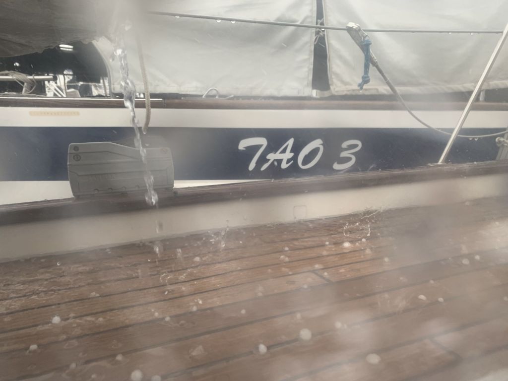 Ich gehe auf NESSAJA um meine Pranken zu waschen. Auf dem Weg dorthin überblicke ich die Marinaeinfahrt und sehe gerade, wie die TARGUI von der Probefahrt zurückkehrt, diese sollte das Zünglein an der Waage werden.