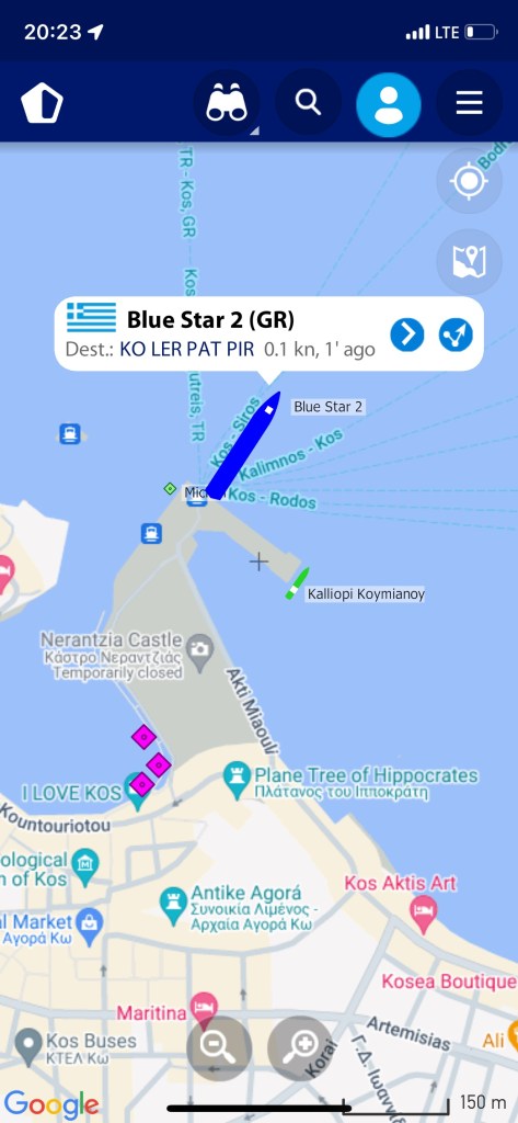Die Fahrt von Leros nach Kos ist nur von kurzer Dauer. Bereits nach rund zwei Stunden hieß es „Passengers for Kos, prepare yourself for disembarking“ – wir packten unsere Siebensachen und verließen, wie soviele andere, den blauen Zubringer.