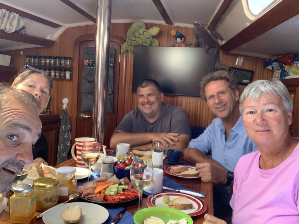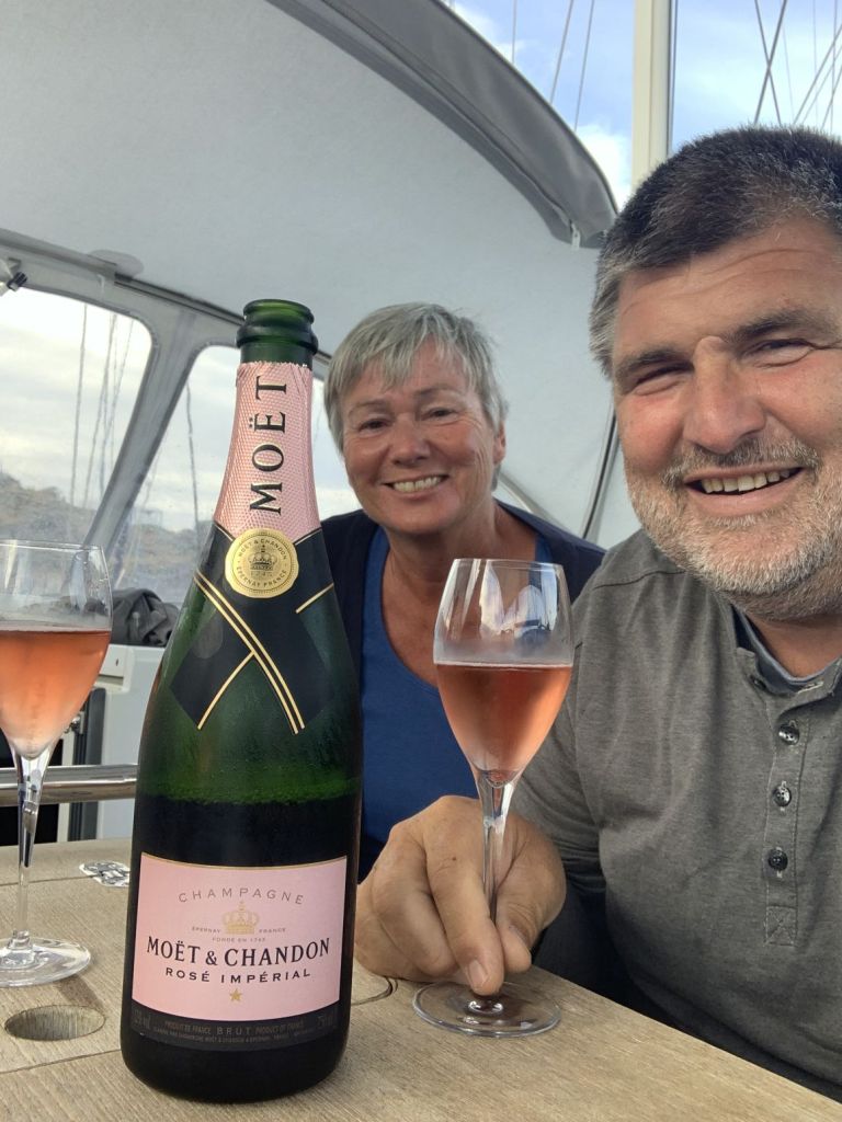 Während ich noch vor mich hinbrummle, rufen Volker und Tina auf die ELOWYN zum Aperitif. Da kommen wir gerne, das rosa Tröpfchen bringt uns auf andere Gedanken!