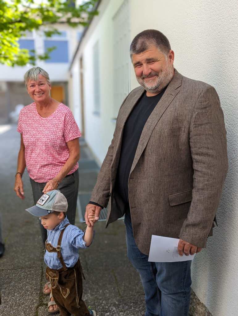 Derart gestärkt konnte der Tag beginnen. Wir besuchten Nina und Familie noch einmal in deren Haus, die Kleinste wollte mir noch zeigen wie sie mit ihrem Kettcar herumsausen kann. Geduldig betrachtete ich die rasende Runde im strömenden Regen. Nachdem Sibylle und ich auch das Spieleparadies der beiden Mädchen bewundert hatten, nachdem wir noch eine Tasse Kaffee mit den Eltern getrunken haben, hieß es Abschied nehmen. Geplantes Wiedersehen – August 2025…
