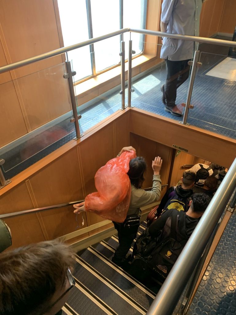 Am Fährhafen erhalten wir die Info, dass unsere Fähre noch später eintreffen würde als erwartet. Zurück zum Boot macht keinen Sinn, also warten wir die zwei Stunden vor Ort und beobachten die Szenerie und die Menschen.