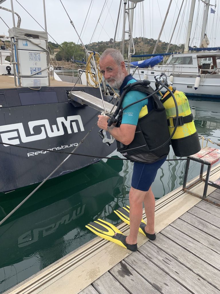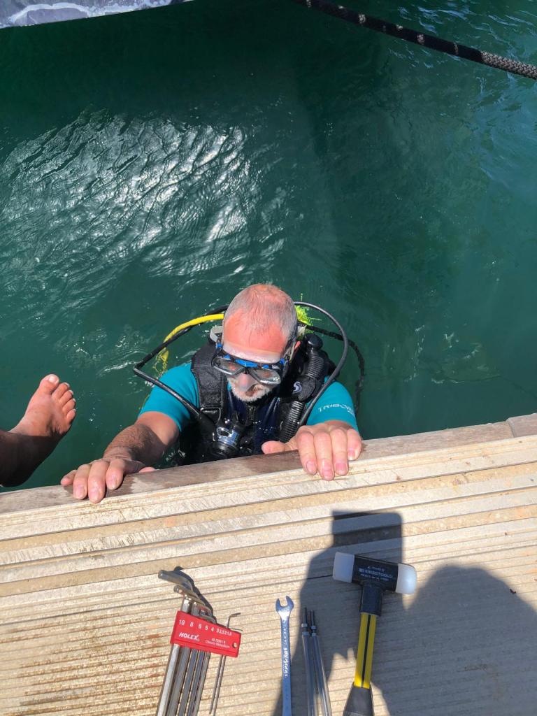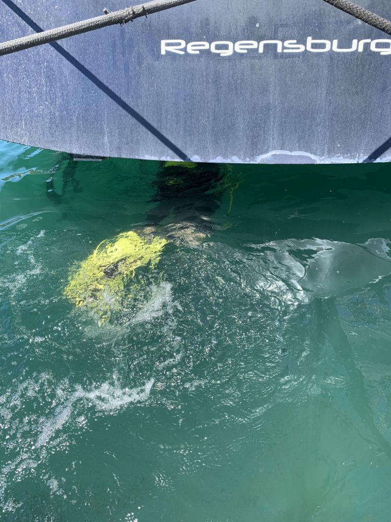 Hans-Peter packt danach abermals seine Tauchausrüstung. Zwischenzeitlich haben wir die richtige Pitcheinstellung erhalten – Soll ist 15°. Diesen Wert hatten wir schon probiert, es verdichtete sich somit die Annahme, dass der Fehler anderweitig zu suchen ist.