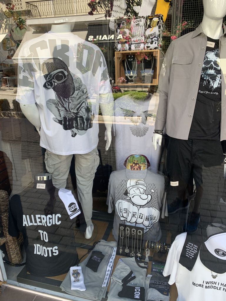Unsere Zeit erlaubt es, dass wir mit dem öffentlichen Bus zum Flughafen fahren. Das kostet für uns beide 7,60€ statt der Taxifahrt für schlanke 40.-€. Auf dem Weg dorthin schlendern wir an einem Szene-Bekleidungsladen vorbei – ich überlege ob ich mir eines der Shirts kaufen soll. Ihr ahnt welches…