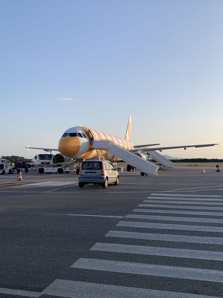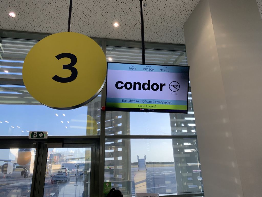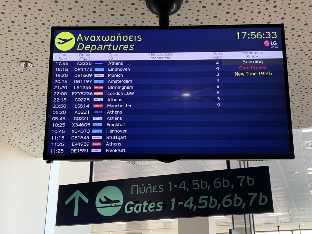 Wir kommen rechtzeitig am Flughafen an. Das deutsche „rechtzeitig“ bedeutet in Griechenland „viel zu früh“. Dummerweise addiert sich zu der ohnehin langen Wartezeit auch noch eine Flugverspätung! Es gilt, sich abermals zwei Stunden um die Ohren zu schlagen.