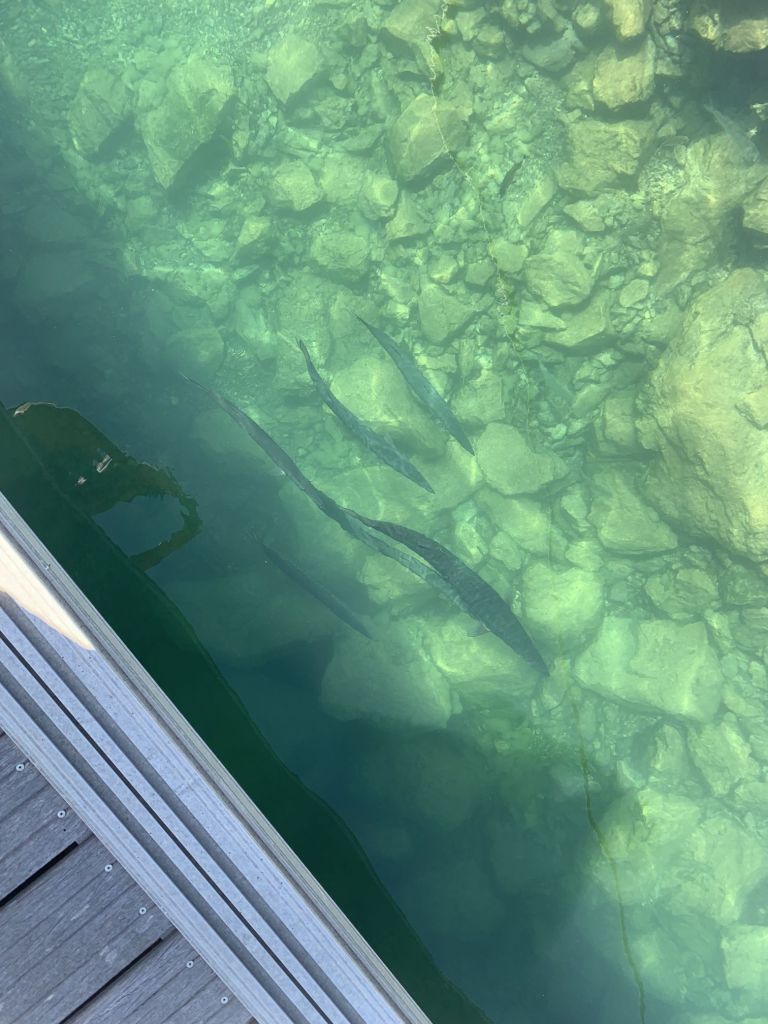 Am Folgetag gehe ich morgens früh über unseren Steg am Außenkai und sehe nach langer Zeit einmal wieder unsere Barracudafamilie. Langsam und gemächlich ziehen die Jäger ihre Runde.