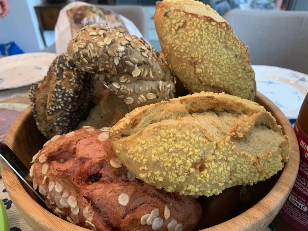 Sibylle holt Semmeln für alle und wir frühstücken erstmal zusammen, herrlich! Semmeln und Brezen sind etwas, was ich in Hellas schmerzlich vermisse.
