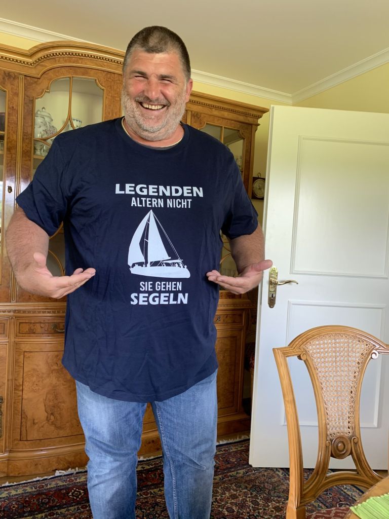 Zum Abschied überreicht Werner ein Geschenk, ein besonderes Dankeschön, über das ich mich sehr freue. Er ist übrigens der Einzige, der von sich sagen kann, mir ein T-Shirt geschenkt zu haben, welches eher eine Nummer zu groß war 😉