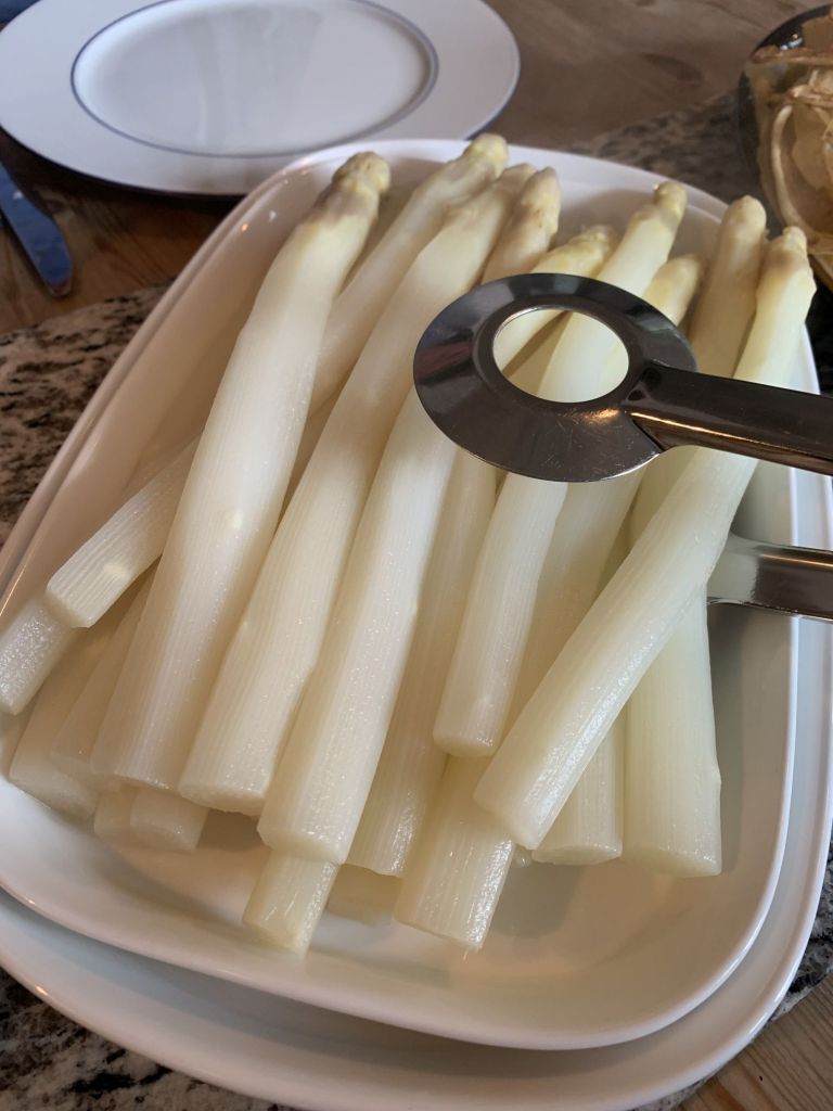 Ja, richtig gehört! Sibylle träumt seit unserer Landung von „Spargel satt“ und Schwägerin Martina wird ihr diesen Wunsch erfüllen. Was zunächst nicht so ganz klar war, der Spargel würde in Pfannkuchen eingewickelt werden und mit allerlei „Leckereien“ garniert werden. Das freut mich! Gleichzeitig stelle ich für mich fest, dass die Waage sicherlich einen technischen Defekt hatte.