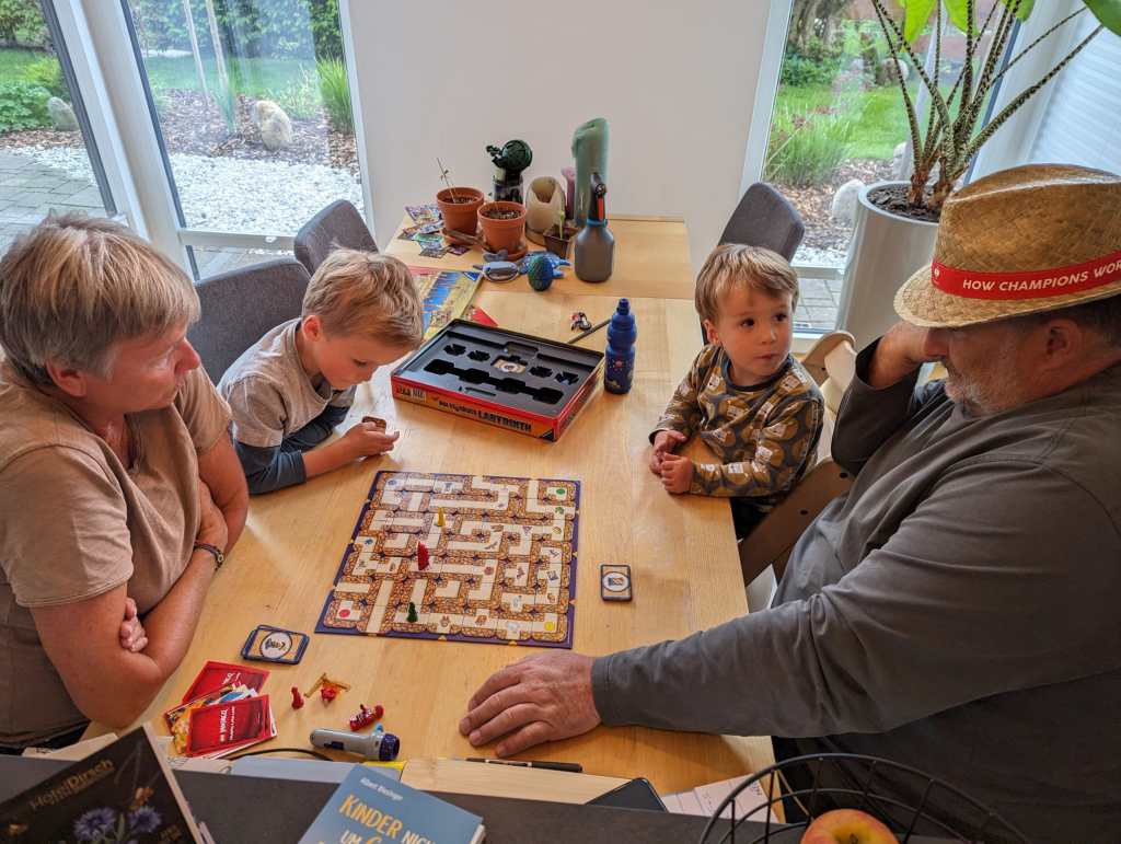 Wir schnappen die Zwerge an ihren frühkindlichen Bildungsstätten auf und bringen sie nach Hause. Etwas später trifft die Mama ein und wir begrüßen uns alle herzlich! Gleich nach Kaffee und Kuchen ruft die großelterliche Pflicht und wir werden zu einer Runde „Das verrückte Labyrinth“ verpflichtet.