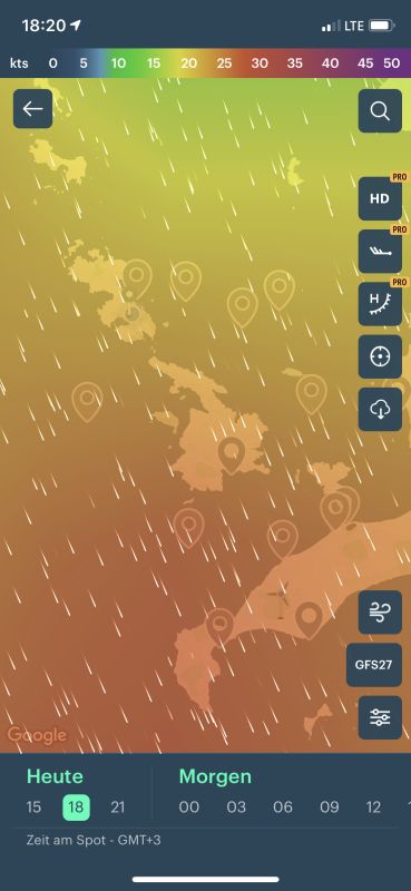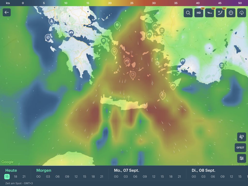 Dieser Windy Screenshot zeigt die Wetter- / Windsituation so zwei, drei Tage vor der geplanten Abfahrt. Ohne jetzt auf Details einzugehen, die einzelnen Inseln könnt Ihr Euch auch selber heraussuchen, der Meltemi zeigte sich mal wieder von seiner aggressiven Seite – und das sollte sich auch über den ganzen Urlaub nicht ändern.