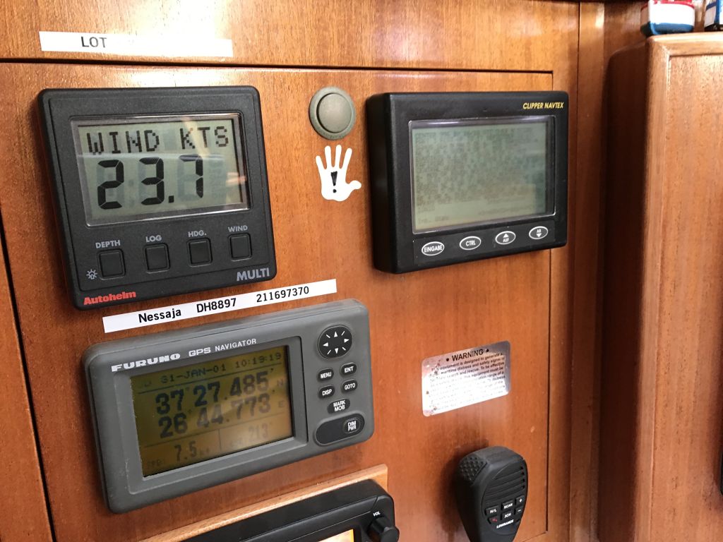 Der geübte Beobachter erkennt sofort – Schaumkrönchen am Wasser, manchmal weit weg – wir mussten uns zum Baden, zum Cafe und zum Dinner immer Leelagen aussuchen, der Wind war auch an Land richtig kräftig. Uns wurde das bei einem Blick auf unsere Anzeigen selbst im Hafen immer wieder bewusst…