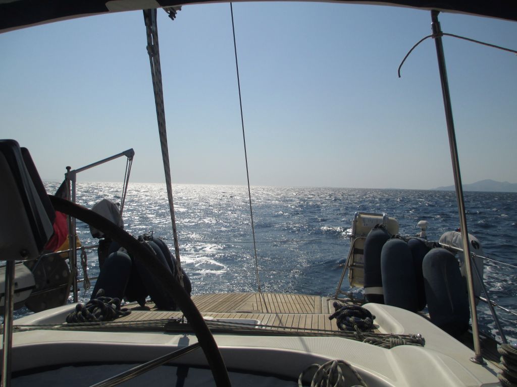 Als wir bei Kalymnos um die Ecke kamen wurde der Spaß größer. Die Welle von achtern flachte ab, der Wind blieb aber, so konnten wir mit leicht gereffter Besegelung Kos direkt anlegen und hatten traumhafte Segelstunden.