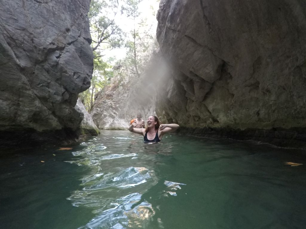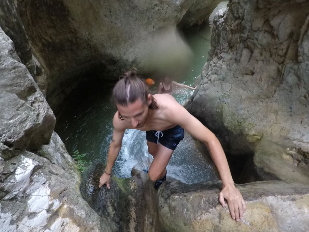An der letzten Gumpe angekommen muss man sich umziehen und kann dann den Bachlauf hochgehen und durch vier natürliche Becken gehen, klettern oder schwimmen – es fühlt sich an wie ein ECHTES Abenteuer, und macht VIEL Spaß!