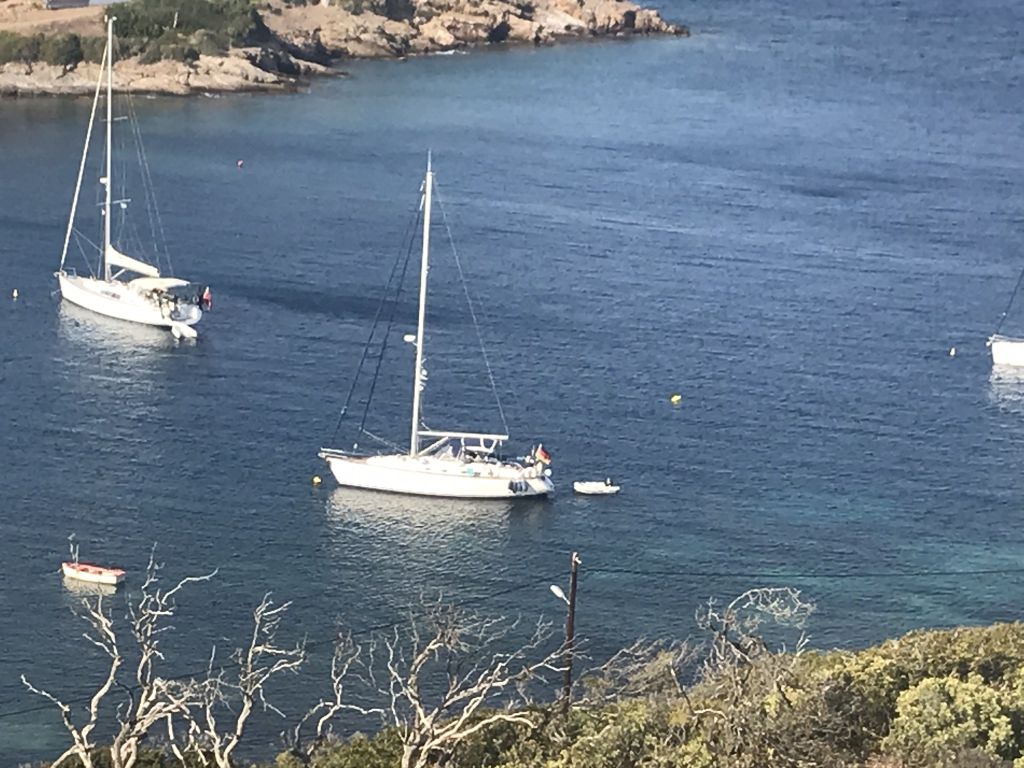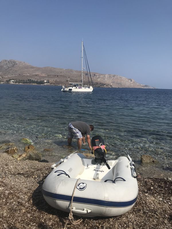 Das Dinghy an Bord, alles aufklarieren und schon kann es losgehen. Die Strecke war nicht allzu weit und damit es für uns auch mal etwas Anderes ist, haben wir beschlossen, direkt unterhalb des Lokales unseres Freundes Dimitris an eine der Bojen zu gehen. Diese waren nicht wirklich billig, sind dafür offiziell und sicher.