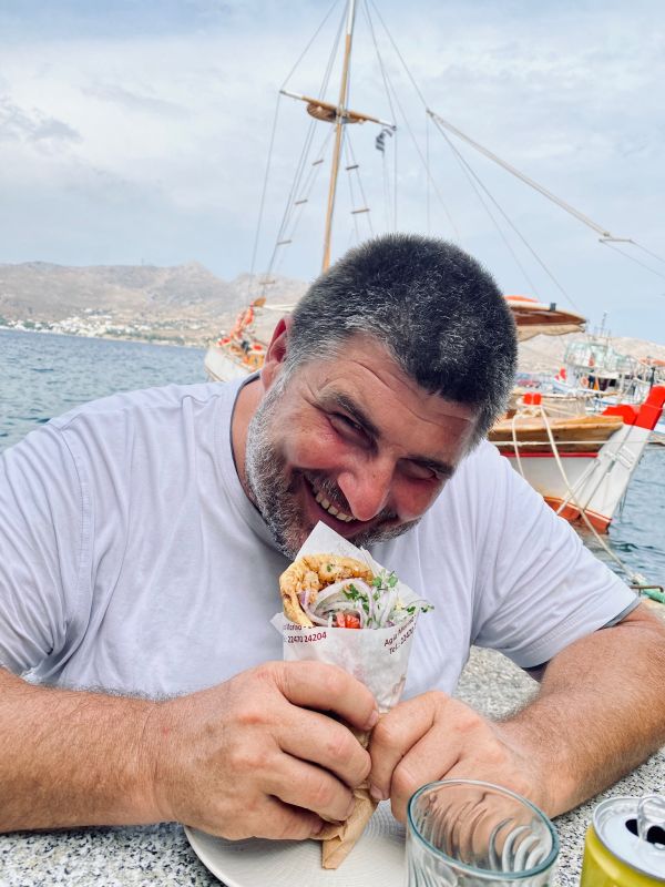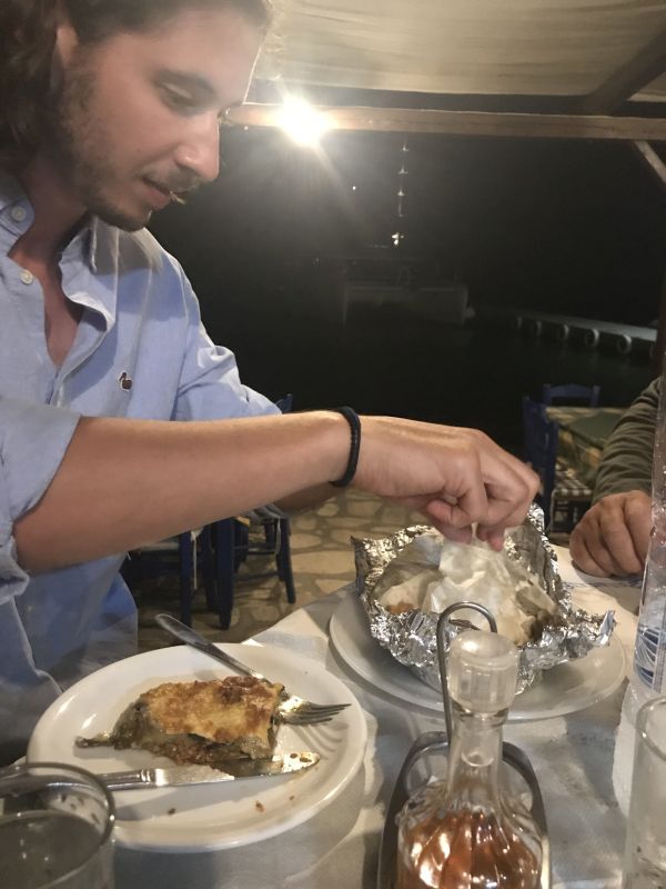 Klar haben wir sofort nach dem Baden und dem Anlegeschluck das Dinghy zu Wasser und sind an Land gefahren um Dimitris zu besuchen und einen Tisch für den Abend zu reservieren.