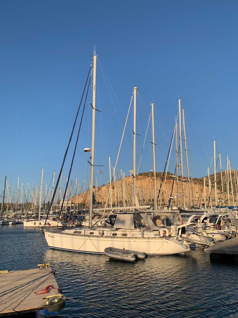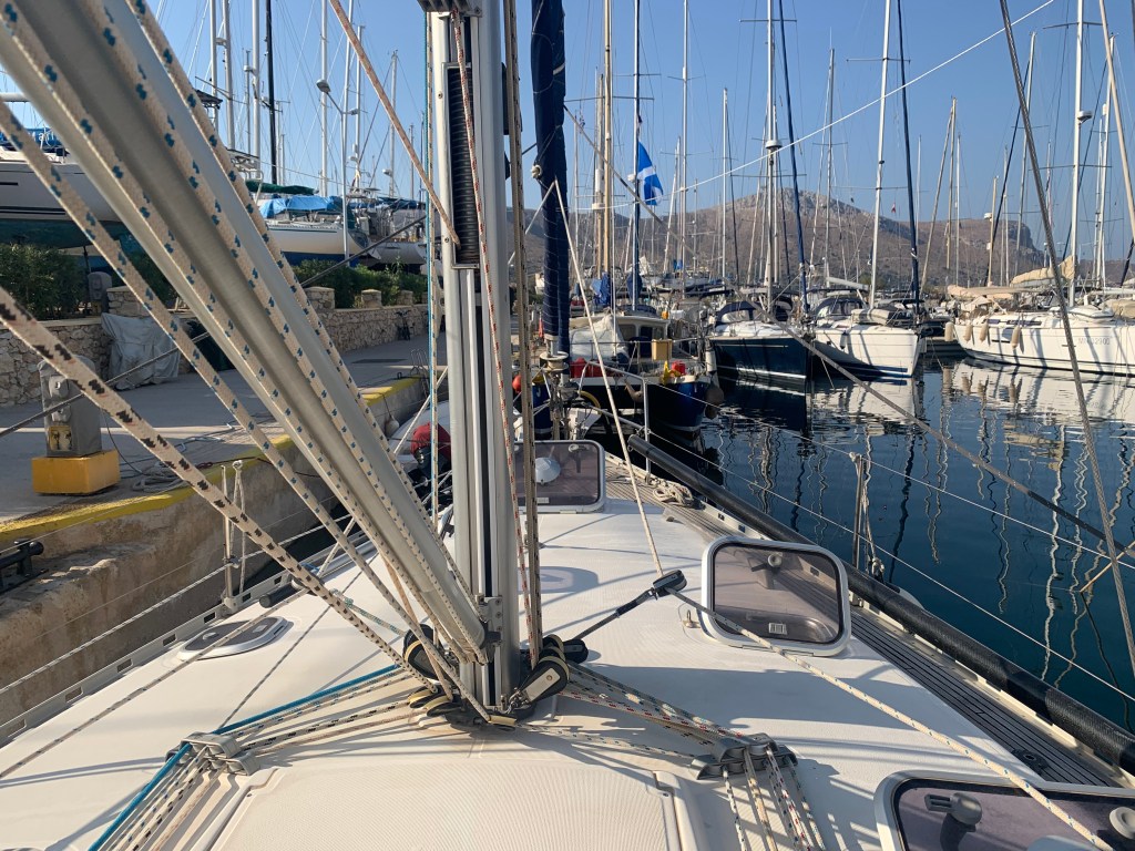Wenn man heute zu einem Besichtigungstermin kommt, dann empfängt einen das Schiff an seinem Liegeplatz in der Leros Marina Evros. Sie liegt dort, wie ihr es auf den zwei einleitenden Bildern sehen konntet. Man betritt das Achterdeck und geht in ein ausreichend großes Cockpit.