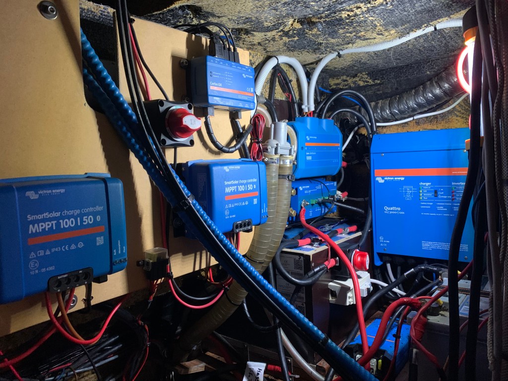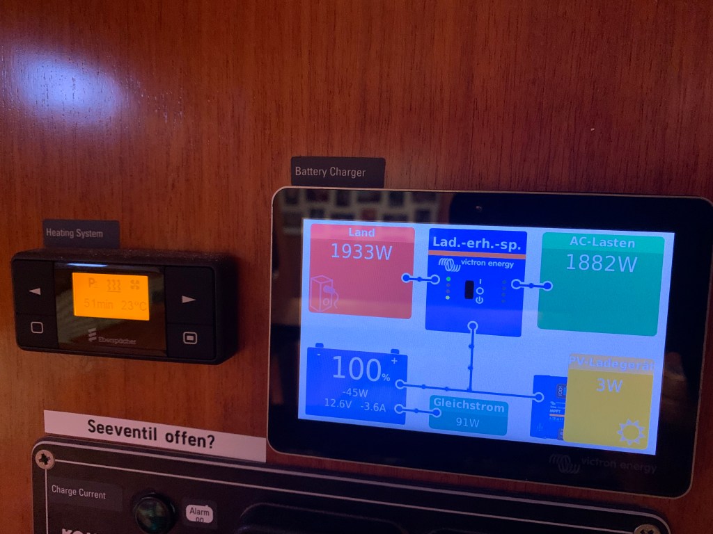 Ok, zugegeben – da steckt mehr dahinter! Der Bildschirm und die App sind natürlich das Tüpfelchen auf dem i. Es ist eine komplette Anlage die hier gesteuert wird und das Schiff „unter Strom“ setzt – der Victron Quattro ist NESSAJAs Herz, hier werden alle Systeme mit Energie versorgt!