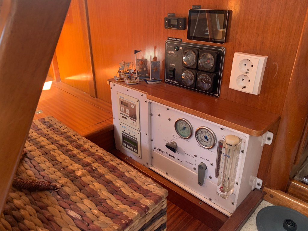 Unter der Niedergangstreppe befindet sich die Schaltzentrale von NESSAJA – das Kontrolldisplay für die elektrische Anlage, das Bedienteil für den Kohler 6.5kV Generator und die Bedienelemente für den Village Marine 90ltr. Wassermacher. Auch die Heizung wird von hier bedient.
